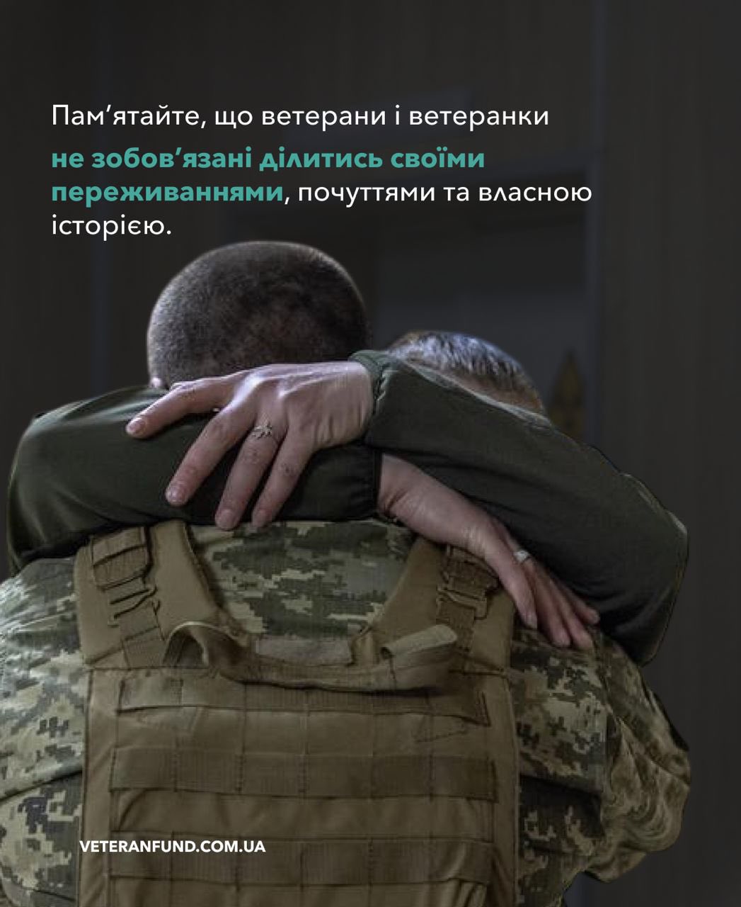 Детальніше читайте у гайді “Як спілкуватися з ветеранами і ветеранками”: https://veteranfund.com.ua/wp-content/uploads/2025/03/Komunikatsiia-z-veteranamy-druk.pdf