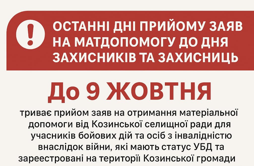 Шановні мешканці Козинської громади! Нагадуємо, що до 9 жовтня триває прийом заяв на отримання одноразової матеріальної допомоги. Ця допомога призначена для учасників бойових дій (УБД) та осіб з інвалідністю внаслідок війни, які мають відповідний статус та зареєстровані на території нашої громади. Це важлива соціальна ініціатива, що реалізується в межах Комплексної програми соціальної підтримки «Турбота», спрямованої на підтримку наших захисників та їхніх родин.