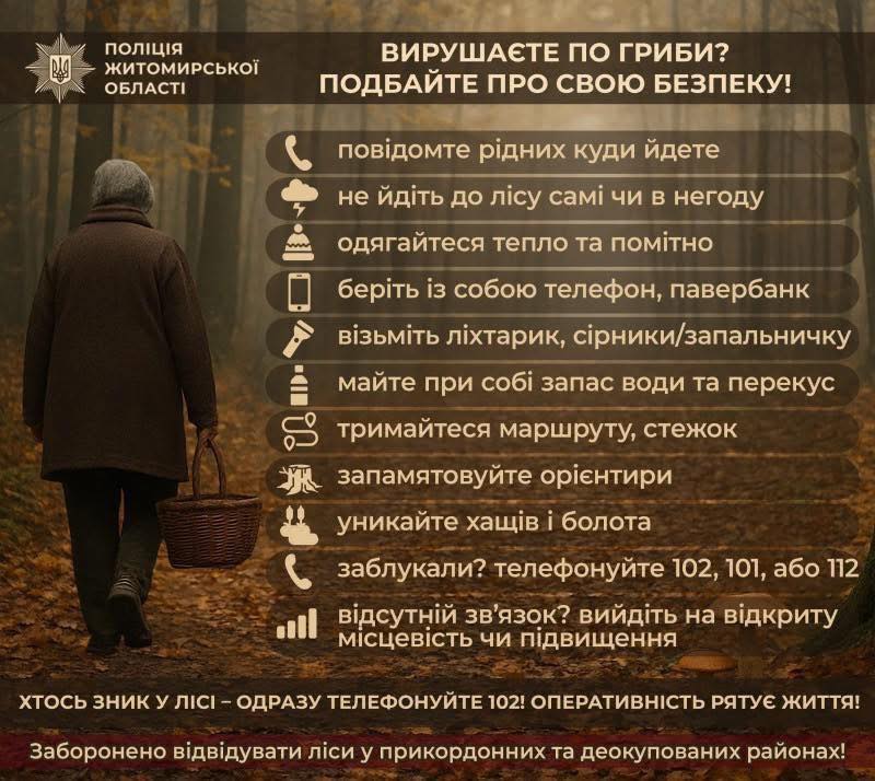 🍄🍁🍂Осінь – це не лише час тихого полювання за грибами та ягодами, але й період, коли ризик загубитися в лісі значно зростає. На Житомирщині, на жаль, почастішали випадки, коли люди, вирушаючи до лісу, потребують допомоги рятувальників та поліції. Щоб зробити ваші походи до лісу безпечнішими, поліція Житомирської області нагадує прості, але надзвичайно важливі правила безпечного відвідування лісу.
