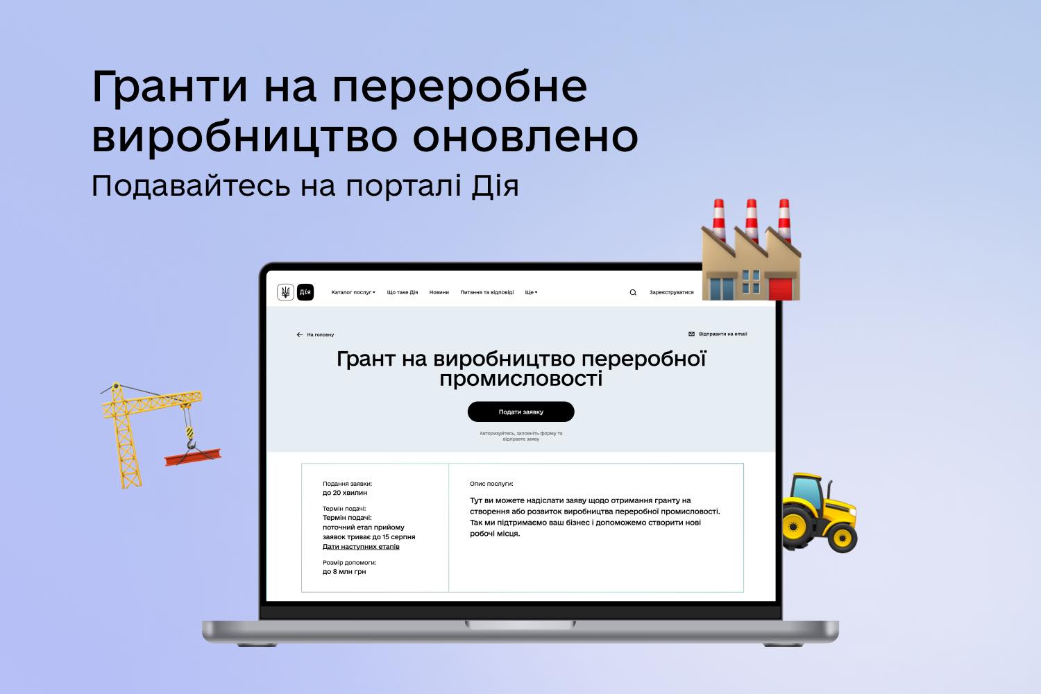 Підприємці, оформлюйте повторно грант на розвиток чи запуск переробного виробництва через портал Дія. Отримані кошти вкладайте у придбання, доставку та введення в роботу виробничого обладнання.