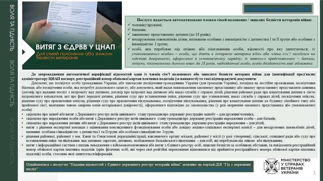 • Члени сімей зниклих безвісти або полонених ветеранів війни: Це стосується чоловіка/дружини, батьків, законних представників дітей (до 18 років), опікунів тощо, для яких підтвердження статусу є критично важливим.