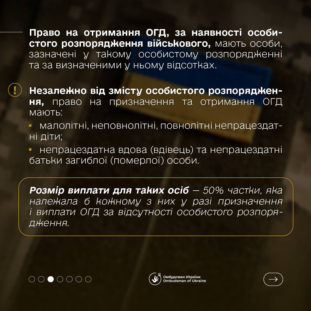 Офіс Омбудсмана України активно працює над вирішенням питань, пов’язаних із призначенням та виплатою одноразової грошової допомоги (ОГД) у розмірі 15 мільйонів гривень родинам загиблих військовослужбовців. Ми отримуємо численні звернення від близьких наших Героїв, які стикаються із затримками у процесі оформлення цієї важливої виплати. Причини зволікань можуть бути різними, зокрема, несвоєчасне надання необхідних документів військовими частинами або тривалий розгляд документів Комісією Міністерства оборони України. Наша інституція ефективно реагує на такі ситуації, домагаючись поновлення прав рідних загиблих воїнів та забезпечення їм належної підтримки.