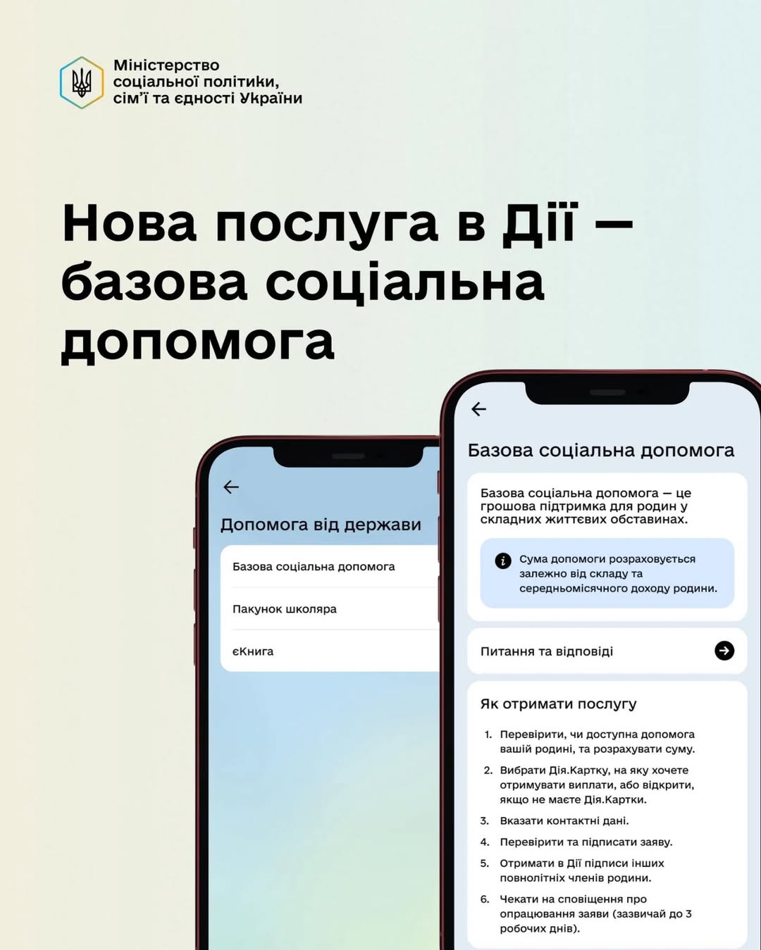 📲 Оформлюйте базову соціальну допомогу онлайн через зручний застосунок Дія! Це інноваційна система соціальної підтримки, яка консолідує п’ять різних видів виплат в одну, спрощуючи процес отримання державної допомоги. Сервіс розроблено спеціально для родин, які наразі отримують одну або декілька з наступних видів допомоги: допомога малозабезпеченим сім’ям; виплата на дітей одиноким матерям; тимчасова допомога дітям, чиї батьки ухиляються від сплати аліментів, або їхнє місцезнаходження невідоме. Щоб скористатися цією новою можливістю, переконайтеся, що ви оновили застосунок Дія до останньої версії. Процес оформлення надзвичайно простий: 1️⃣ Увійдіть у розділ “Сервіси”, оберіть “Допомога від держави”, далі “Базова соціальна допомога” та натисніть “Отримати допомогу”. 2️⃣ Система розрахує щомісячну суму допомоги, про що ви отримаєте сповіщення. 3️⃣ Якщо запропонований розрахунок вас влаштовує, натисніть “Подати заяву” та виберіть “Дія.Картку” для отримання коштів. 4️⃣ Уважно перевірте дані у вашій заяві та підтвердьте свою згоду на відмову від інших видів допомоги, які будуть об’єднані в одну загальну виплату. 5️⃣ Завершіть процес, підписавши заяву за допомогою “Дія.Підпису”, та надішліть запрошення для підпису повнолітнім членам вашої родини. 6️⃣ Як тільки всі необхідні підписи будуть зібрані, заява автоматично буде надіслана на розгляд. Готово! Після успішного схвалення ви отримаєте сповіщення про призначення нової, об’єднаної допомоги. Цей пілотний проєкт, розрахований на два роки, є важливим кроком Міністерства соціальної політики України. Відомство активно працює над тим, щоб зробити цю комплексну допомогу постійною. З цією метою Уряд України вже схвалив відповідний законопроєкт, який невдовзі буде передано на розгляд до Верховної Ради. Ця послуга є результатом плідної співпраці Міністерства соціальної політики та Міністерства цифрової трансформації, а її реалізація стала можливою завдяки підтримці “Проєкту підтримки Дія”, який UNDP Ukraine / ПРООН в Україні втілює за фінансової підтримки Королівства Швеція. Це значний крок до цифровізації соціальних послуг та підвищення їх доступності для громадян України.