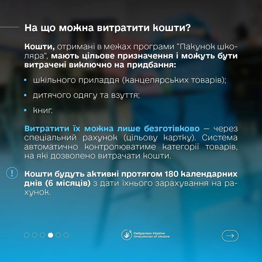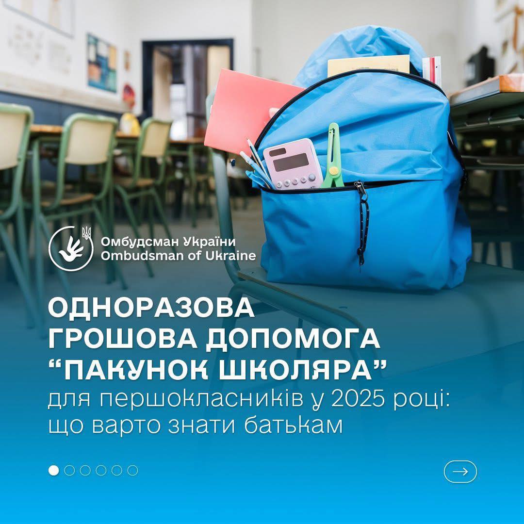 «Пакунок школяра» допоможе батькам майбутніх першачків придбати усе необхідне для школи, наприклад, канцелярське приладдя, дитячий одяг та взуття. Розмір виплати – 5 тисяч гривень на кожного першокласника.