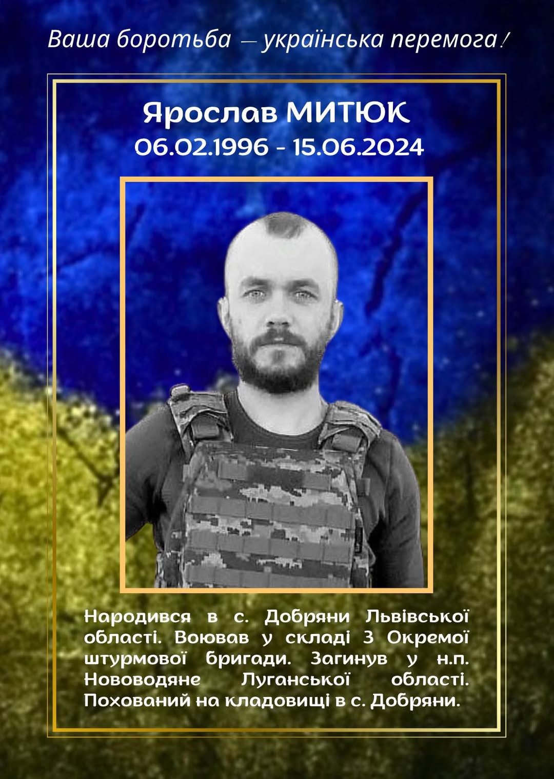 Ярослав не зміг стояти осторонь, коли Батьківщина опинилася в небезпеці. Спочатку він активно волонтерив, допомагаючи армії та тим, хто потребував підтримки. Згодом, відчуваючи поклик серця, Ярослав добровольцем приєднався до лав 3-ї Окремої штурмової бригади, де став прикладом мужності та відваги. Вірний військовій присязі, Ярослав Митюк героїчно загинув поблизу Нововодяного Луганської області, захищаючи незалежність і територіальну цілісність нашої держави від російських окупантів. Його жертовність ніколи не буде забута.