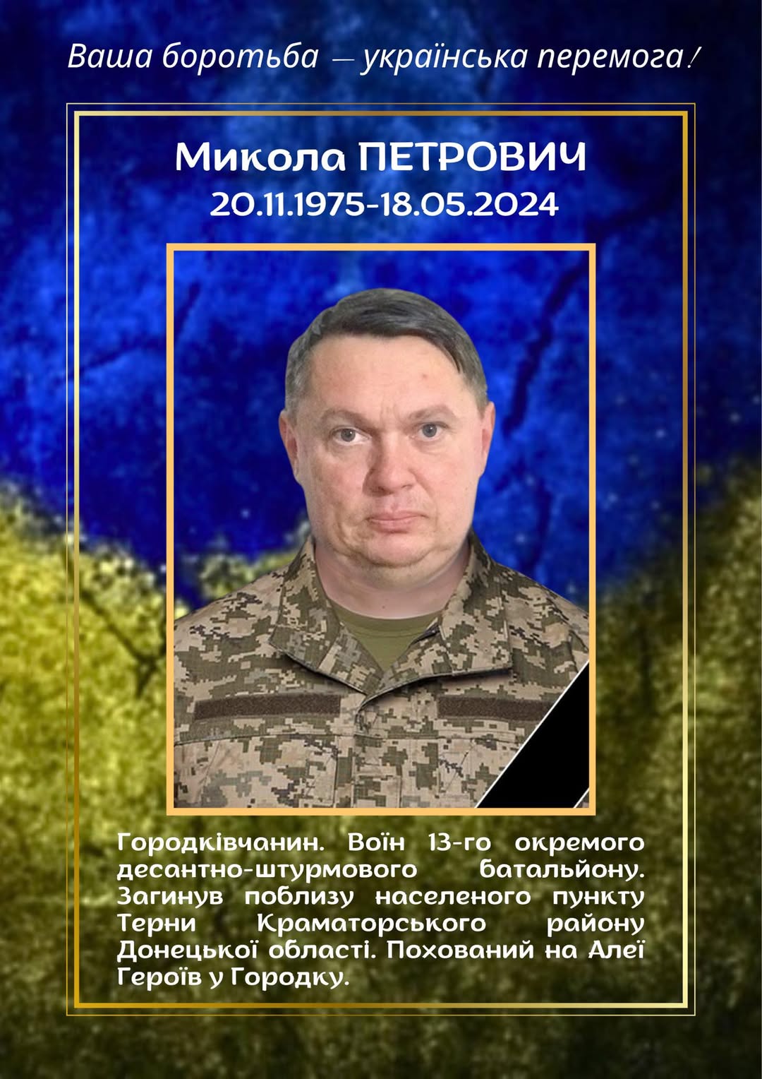 Микола Петрович, сержант 13-го окремого десантно-штурмового батальйону, до останнього подиху залишався вірним військовій присязі. Він виявив неймовірну стійкість та мужність у боях за нашу рідну Батьківщину. Героїчно загинув поблизу населеного пункту Терни, Краматорського району, Донецької області, віддавши своє життя за мирне майбутнє України.