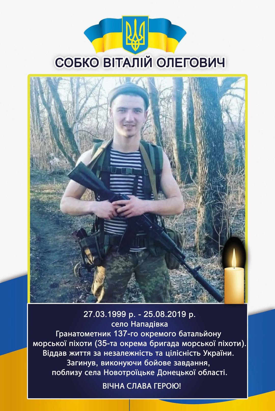 Сьогодні відзначається шоста річниця загибелі нашого Героя, чий подвиг навіки закарбувався в пам’яті громади. Ця дата – нагода згадати про життя та самовідданість воїна, який віддав своє життя за мирне небо над Україною. Ми пропонуємо вам глибше пізнати історію життя полеглого захисника, переглянувши його особисту сторінку на сайті громади у спеціальному розділі «Е-меморіал». Це унікальна можливість віддати шану пам’яті нашого Героя, дізнатися про його життєвий шлях, цінності та мрії, які він плекав. Його жертва не буде забутою, а пам’ять про його мужність житиме у серцях поколінь. Ми запрошуємо вас відвідати сторінку пам’яті за наданим посиланням, щоб вшанувати пам’ять нашого Героя.