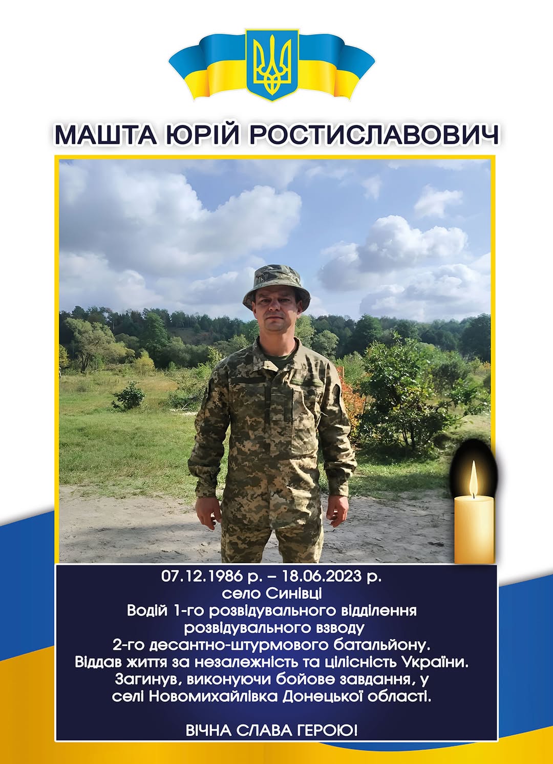Сьогодні, у другу річницю загибелі нашого Героя, ми згадуємо його подвиг та самовідданість. Його ім’я назавжди залишиться в наших серцях як символ мужності та патріотизму. Ми закликаємо всіх небайдужих переглянути історію життя полеглого воїна на офіційному сайті громади, у розділі Е-меморіал, де зібрані спогади, фотографії та відеоматеріали про його життєвий шлях.