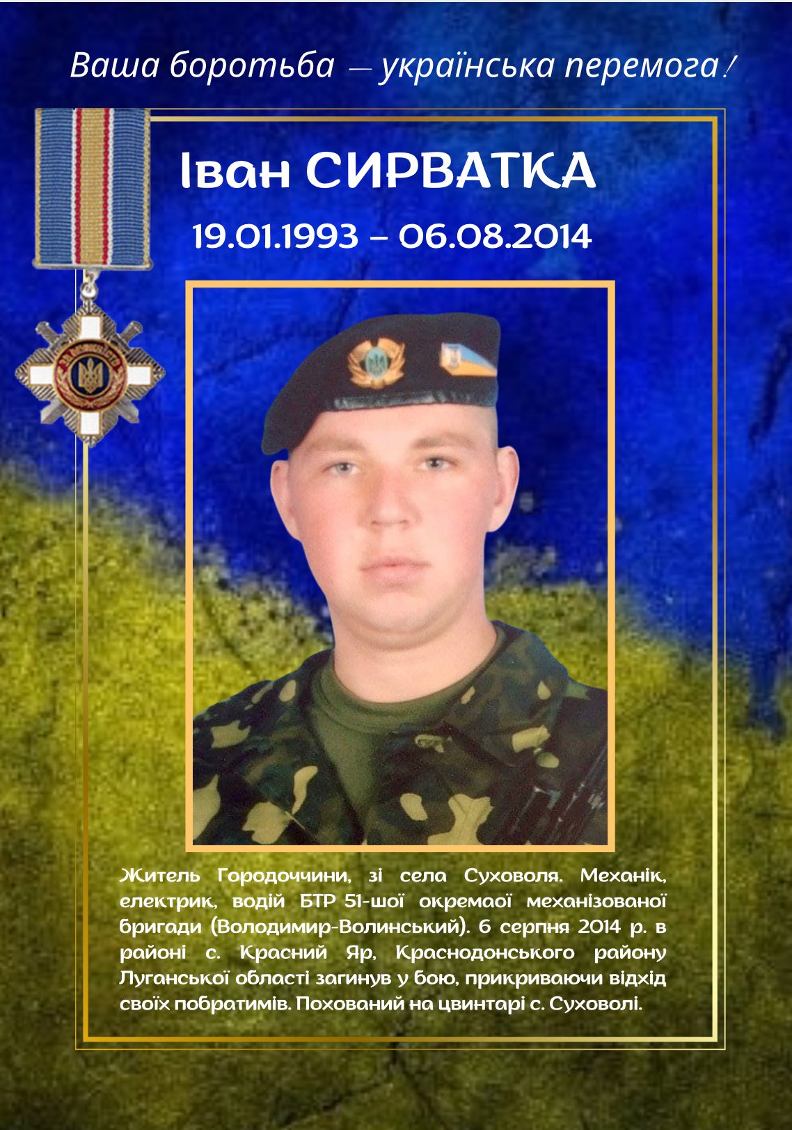 Сьогодні минає 11 років із дня загибелі Івана Сирватки — Героя зі Суховолі, першого захисника, якого втратила Городоччина у російсько-українській війні, та перші роковини нашої скорботи за городківчанином Олегом Репрінцевим. Вони віддали своє життя за Україну.