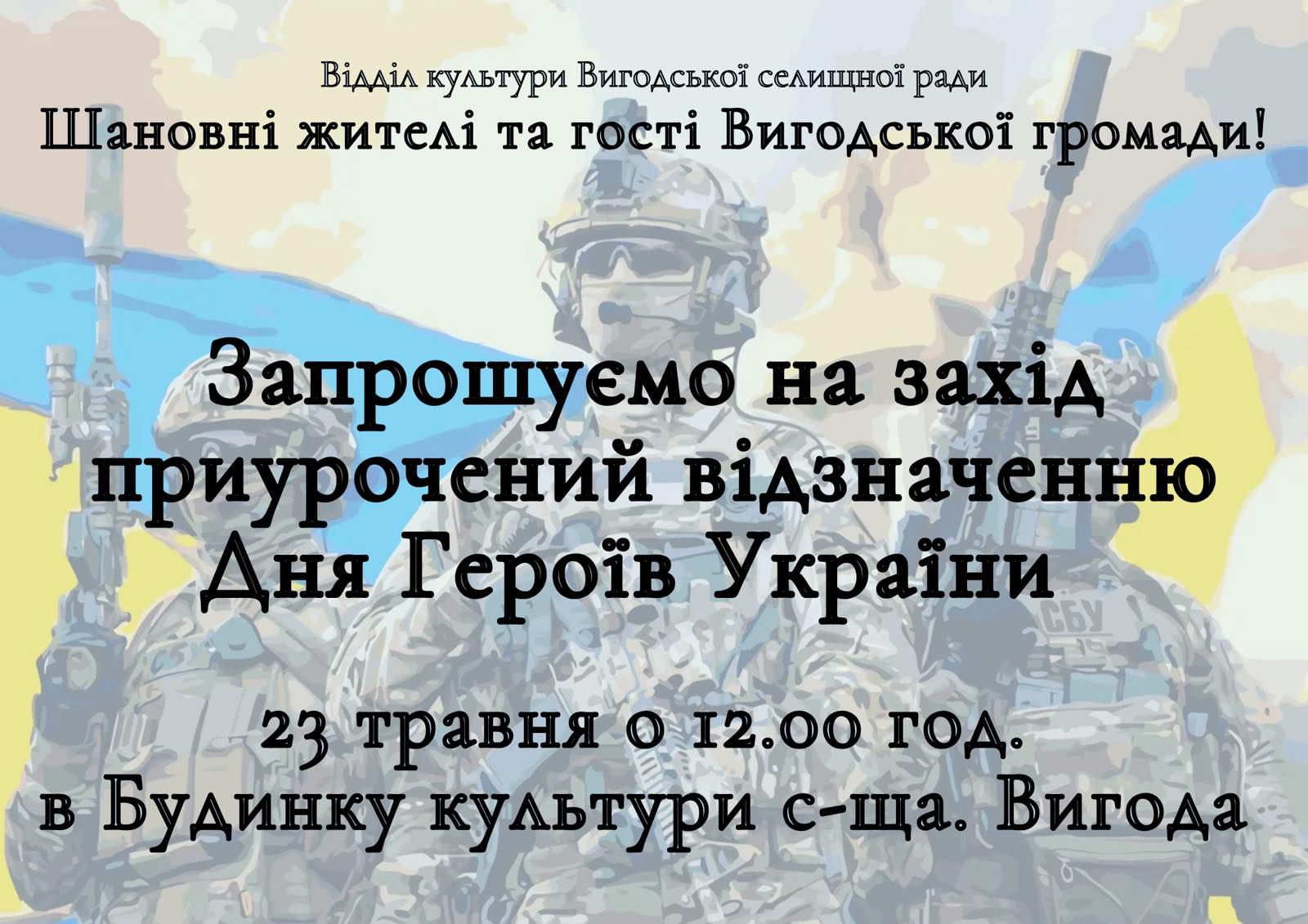 О 12:00 в Будинку культури селища Вигода розпочнеться урочистий захід до Дня Героїв України. Урочистий захід стане символом нашої єдності та поваги до захисників України. День Героїв України – це нагода згадати подвиги та відданість тих, хто боронив та боронить нашу землю.