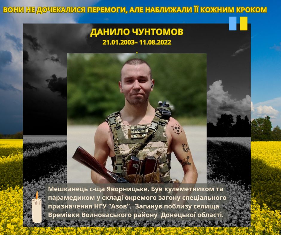 11 серпня — день, що болить. У цей день три роки тому на Донеччині, під Времівкою, обірвалося зовсім юне життя — загинув Данило Чунтомов, дев’ятнадцятирічний доброволець «Азову», наймолодший із трьох братів.