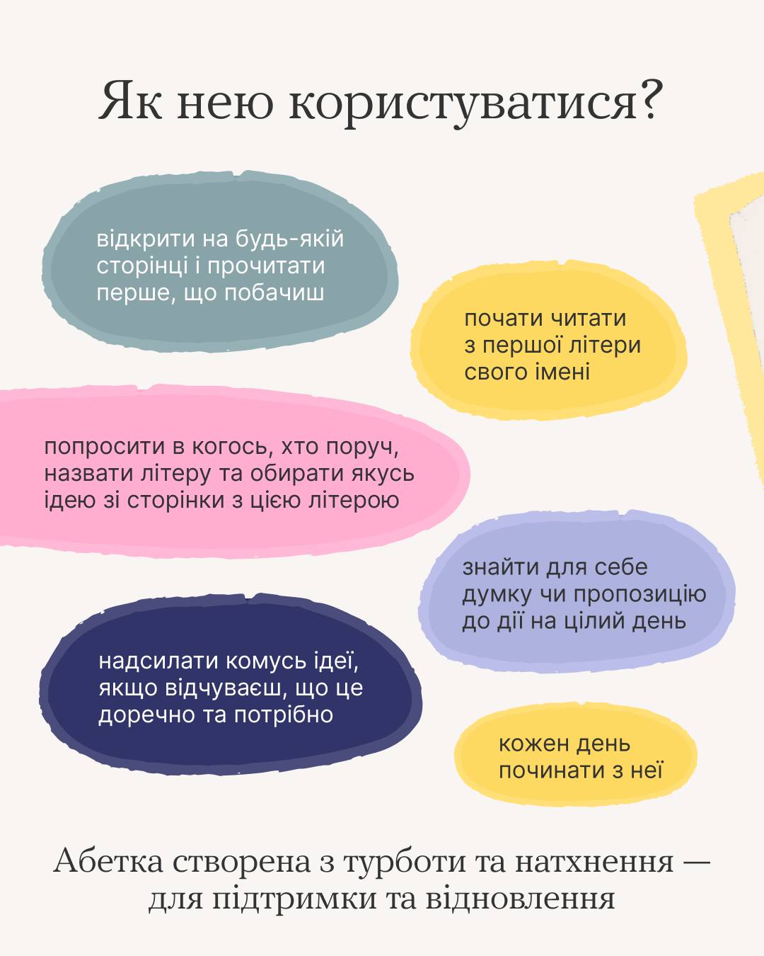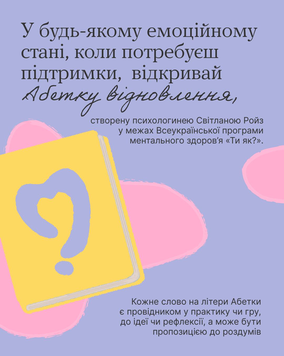 Просто відкривайте її та шукайте натхнення для практичних занять, рефлексій або глибоких роздумів. Завантажити Абетку відновлення можна безкоштовно на платформі «Ти як?»: http://howareu.com/materials/ty-iak-abetka-vidnovlennia-vid-a-do-ia?utm_source=facebook&utm_medium=post&utm_campaign=product_sm