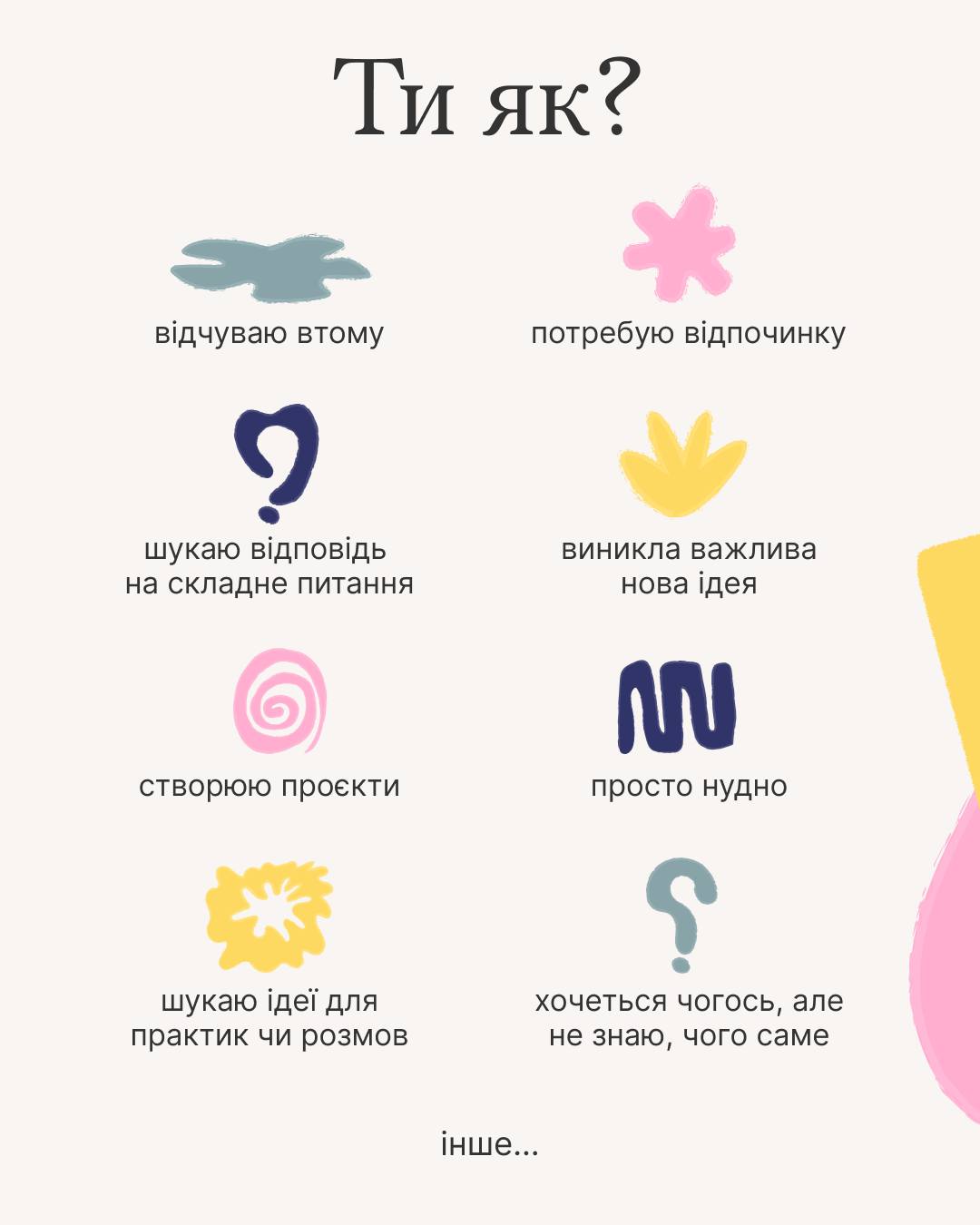 Пропонуємо зіграти в дещо схожу гру, але з більш глибоким змістом – з «Абеткою відновлення». Ця абетка – ваш помічник у пошуку ідей для практики, рефлексії та роздумів. Абетка відновлення допоможе вам знайти нові способи піклуватися про себе та своє ментальне здоров’я.