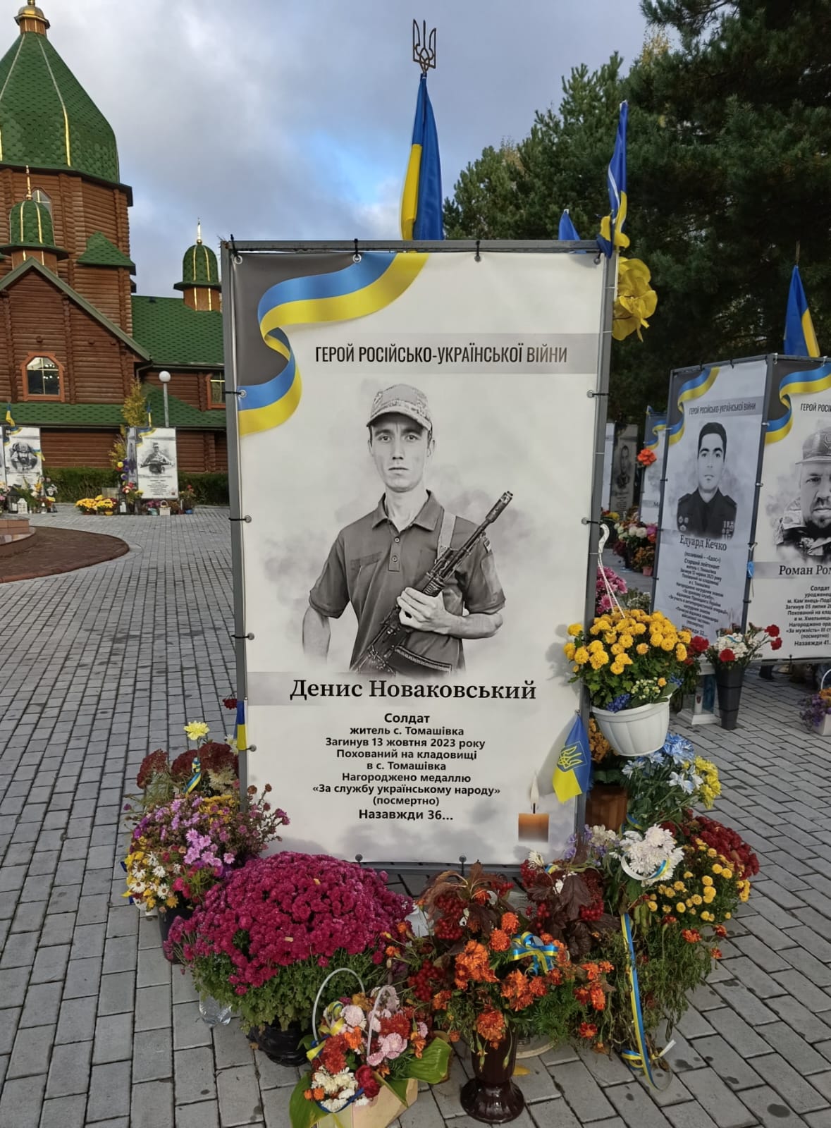Новаковський Денис Олександрович народився 14 вересня 1987 року на Житомирщині. Отримавши робітничу спеціальність майстра з обробки каменю, він у подальшому працював на різних посадах, завжди демонструючи відповідальність та готовність до виконання завдань. З початком повномасштабного вторгнення російських військ в Україну, влітку 2023 року, Денис долучився до лав Збройних Сил України. Після базової підготовки на Рівненщині, восени того ж року, він разом із побратимами з 65-ї окремої механізованої бригади виконував бойові завдання на найгарячіших ділянках фронту, служачи старшим стрільцем-оператором. Свій останній бій Денис прийняв 13 жовтня 2023 року на Запорізькому напрямку. Він був нагороджений медаллю «За службу українському народові» та медаллю «Захиснику Вітчизни» посмертно. Обидва герої, Олександр Фарина та Денис Новаковський, віддали найцінніше – своє життя – за свободу та незалежність нашої держави. Їхній подвиг назавжди залишиться в серцях земляків та в історії України.