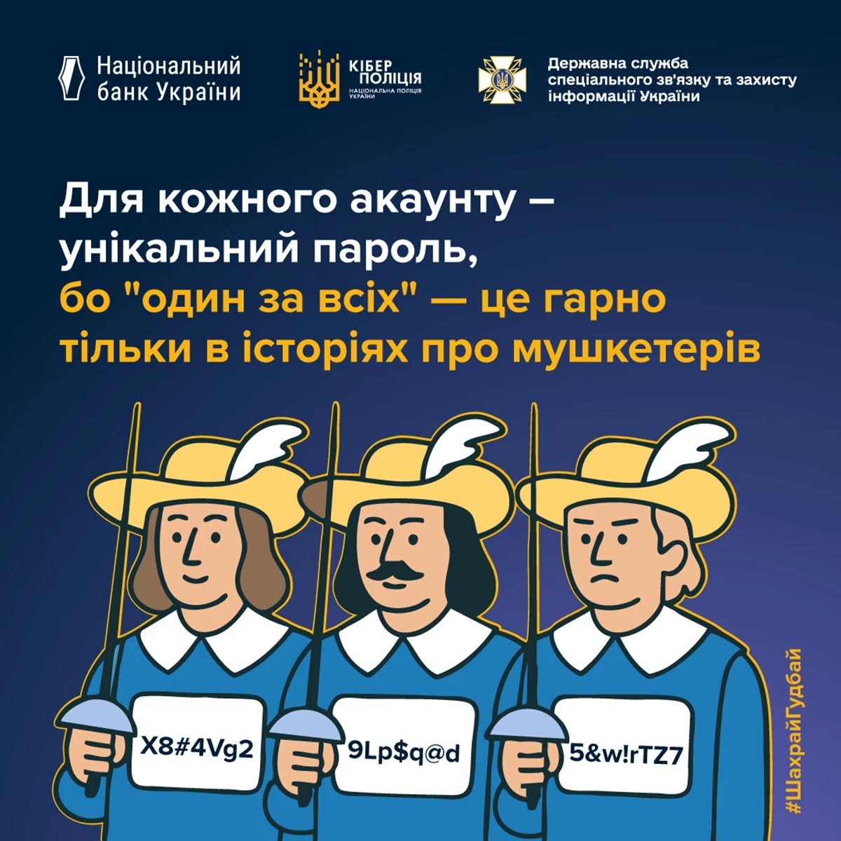 ● Використовуйте унікальний пароль для кожного облікового запису. Пам’ятайте, що принцип “один за всіх” добре працює лише в захопливих історіях про мушкетерів.