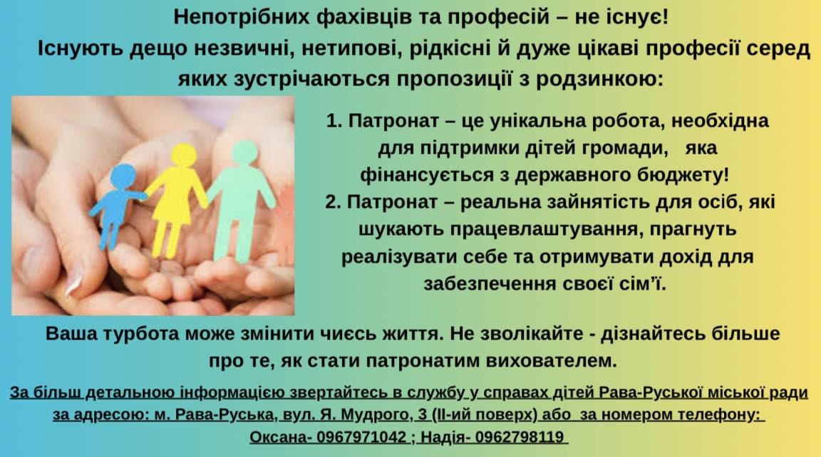 📍📞Якщо ви маєте бажання підтримати дитину та готові стати патронатним вихователем, ми запрошуємо вас звернутися до служби у справах дітей Рава-Руської міської ради. Зв’язатися з нами можна за адресою: м. Рава-Руська, вул. Я. Мудрого, 3, або за телефоном 096 797 1042. Ваша допомога може змінити чиєсь життя на краще.