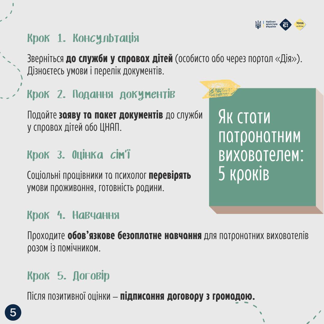 Хто ж може стати патронатним вихователем і як це зробити? Про це детально розповідає інфографіка, яку ми підготували. Дізнайтеся про вимоги до кандидатів, необхідні документи та етапи навчання. Патронат над дитиною – це відповідальна, але надзвичайно важлива місія, яка може змінити життя дитини на краще. Не бійтеся зробити перший крок і подарувати дитині шанс на щасливе майбутнє. Стати патронатним вихователем – це можливість не тільки допомогти дитині, але й збагатити своє життя новими емоціями та досвідом.