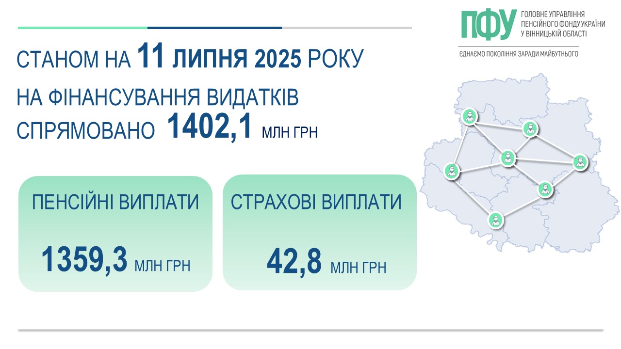 ✅Пенсійним фондом України забезпечено вчасне фінансування та виплату пенсій, страхових виплат жителям Вінницької області. На фінансування видатків станом на 11 липня 2025 року спрямовано 1402,1 млн грн, в тому числі на виплату: