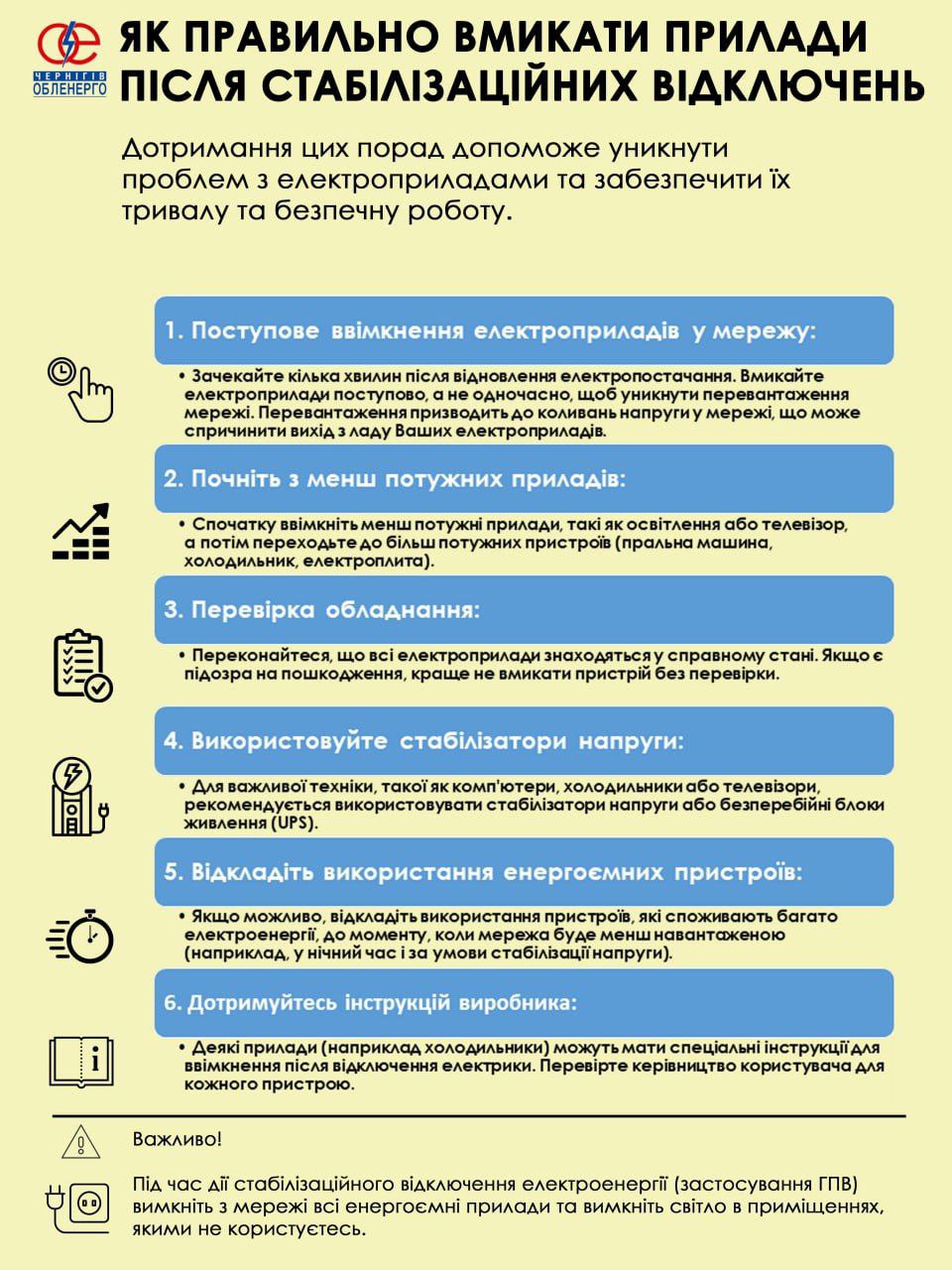 🔸 Після відновлення електропостачання, зачекайте кілька хвилин, перш ніж вмикати будь-які прилади. Це дозволить системі стабілізуватися.