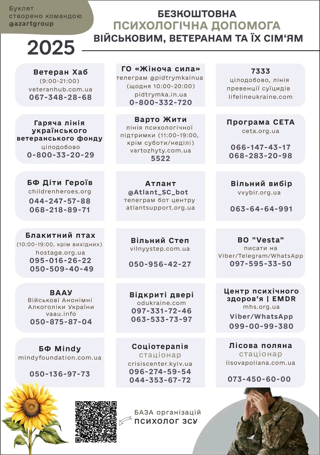 P.S. Номера телефонів організацій можуть змінюватись протягом року – тому є сенс перед направленням за психологічною допомогою попередньо звірити номера телефонів. Також і сайти організацій можуть змінюватись – у такому випадку можна загуглити за назвою організації і віднайти актуальні контакти. Номера телефонів та сайти, зазначені на плакаті, дійсні на квітень 2025 року.