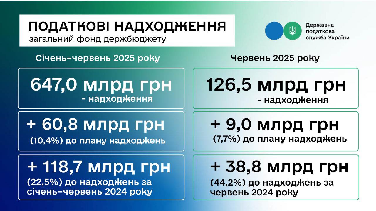 🔹+10,4% (60,8 млрд грн) — до плану надходжень за січень–червень 2025 року