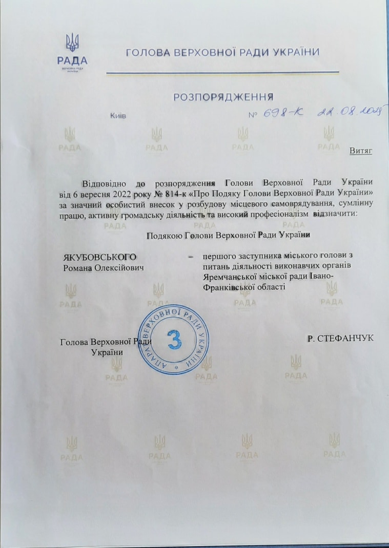 Роман Якубовський отримав Подяку Голови Верховної Ради