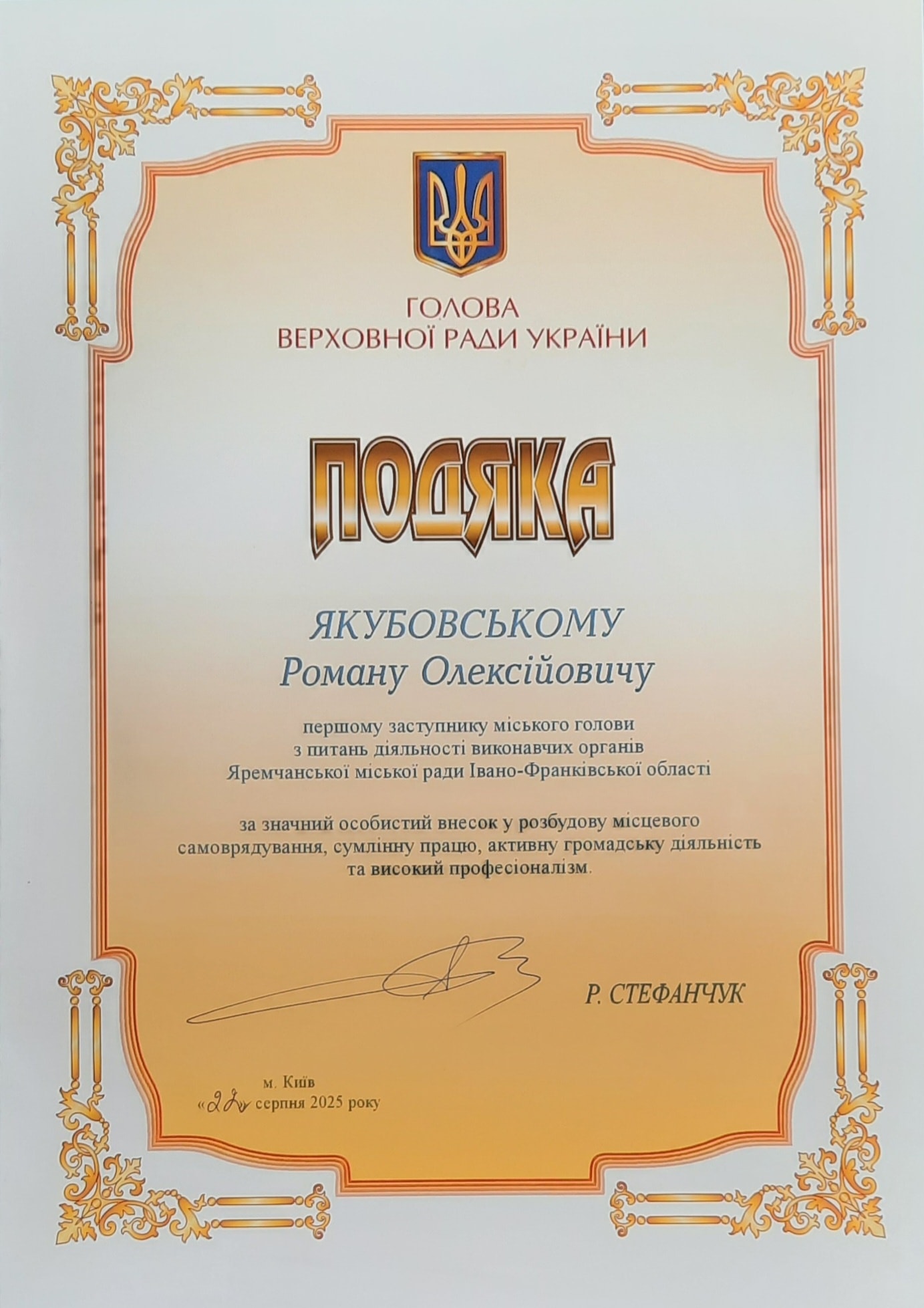 Перший заступник міського голови Роман Якубовський відзначений високою нагородою – Подякою Голови Верховної Ради України. Це визнання є свідченням його значного особистого внеску у розбудову місцевого самоврядування, сумлінної праці, активної громадської діяльності та високого професіоналізму, якого Роман Якубовський послідовно демонструє у своїй роботі. Колектив щиро приєднується до привітань, відзначаючи заслуженість цієї нагороди.