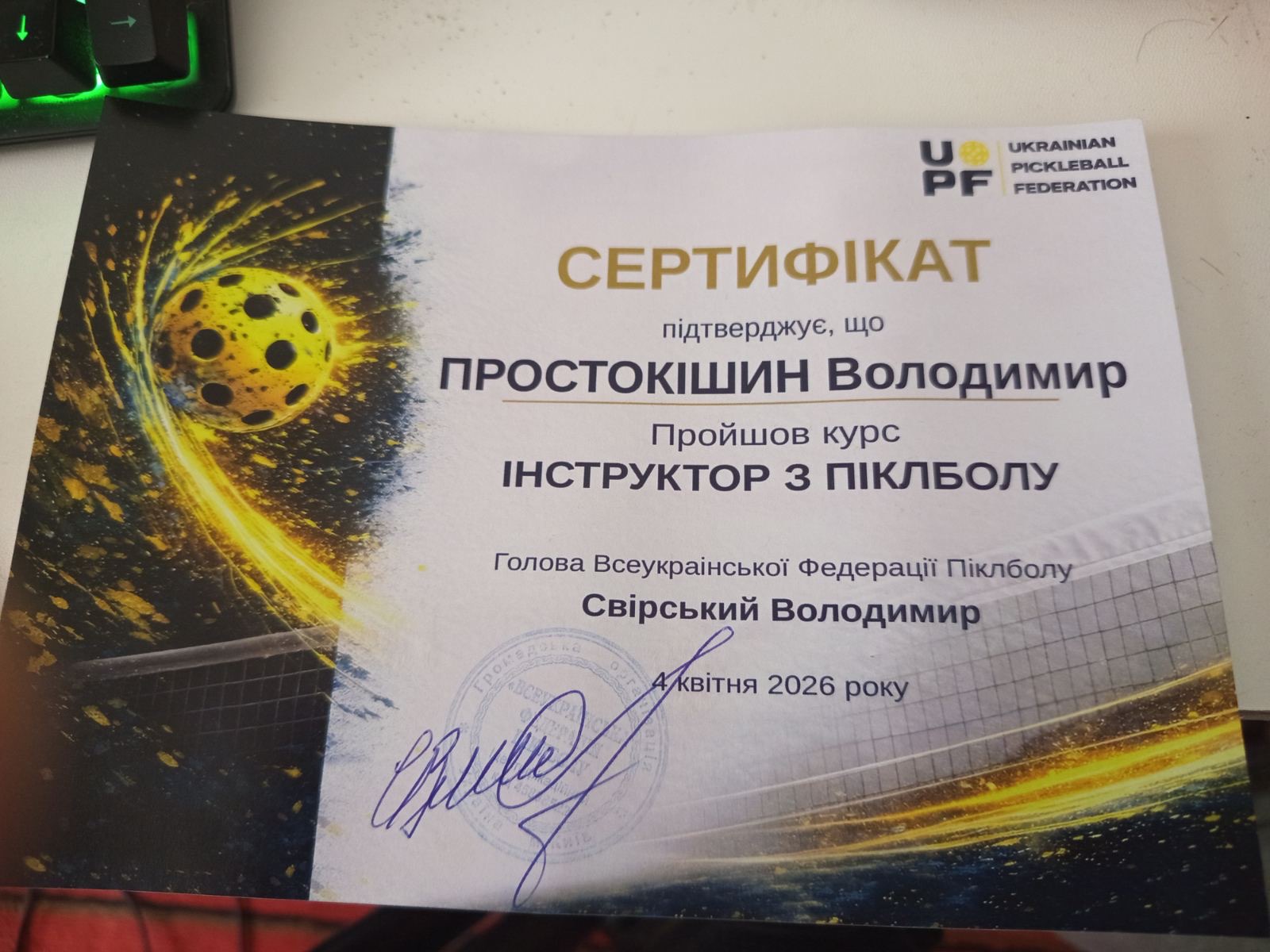 Чоповицьку громаду на тренуваннях представляв Володимир Простокішин – ветеран із села Барвінки. По завершенню тренувань він отримав сертифікат інструктора з піклболу і тепер може ділитися досвідом з усіма охочими.