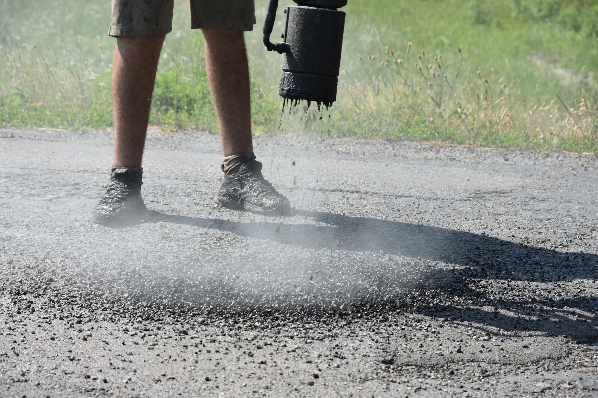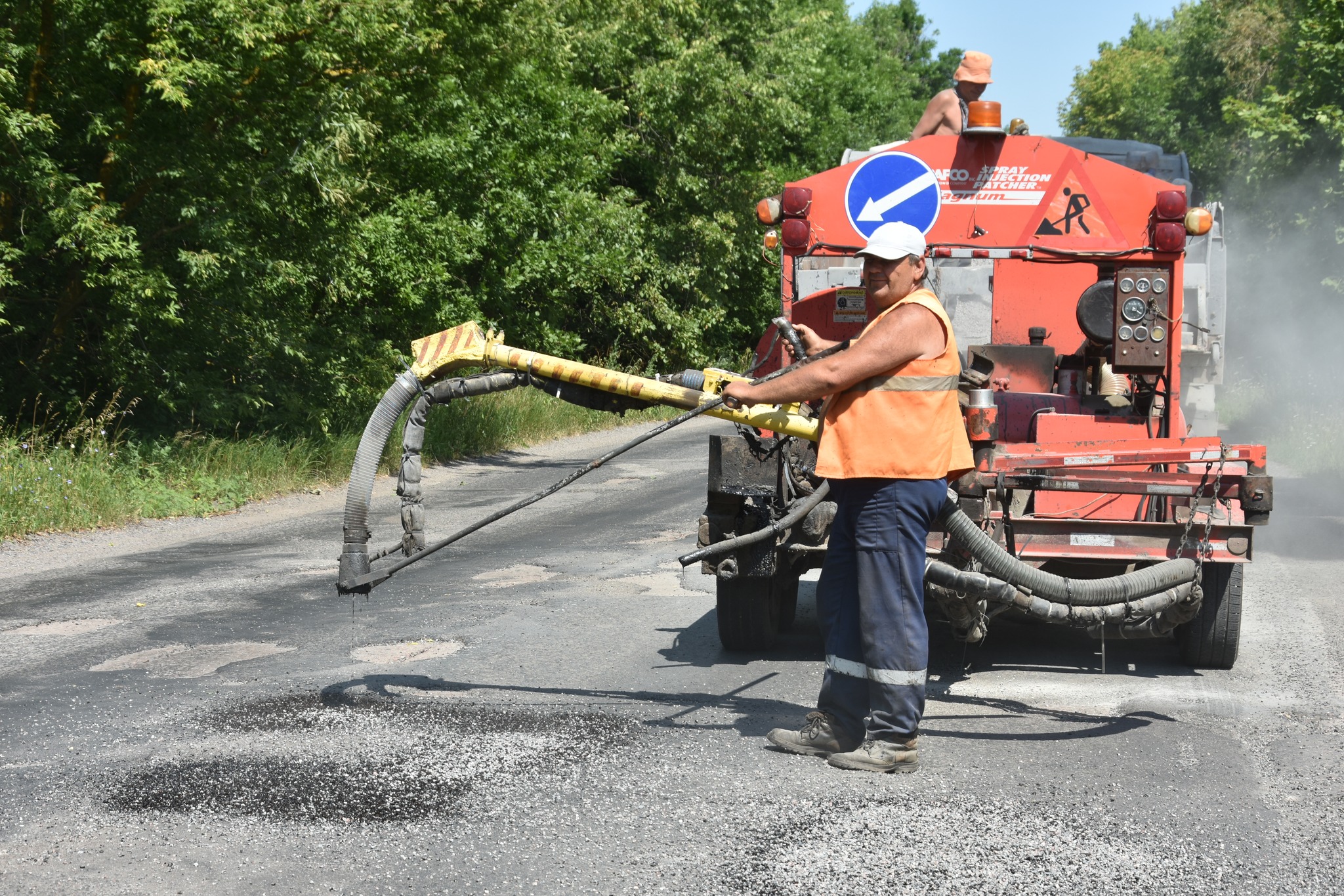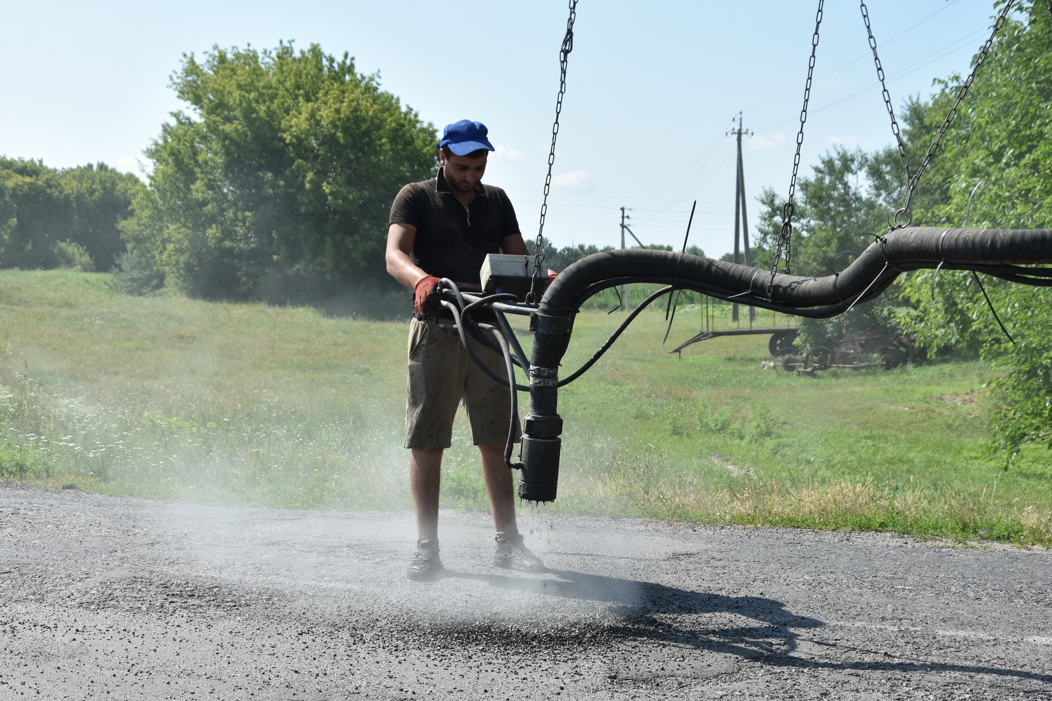 Роботи проводяться повітряно-струменевим методом – це технологія відновлення асфальтобетонного покриття, яка передбачає використання стисненого повітря для очищення пошкодженої ділянки, нанесення бітумної емульсії та заповнення щебенем, що забезпечує швидке та ефективне усунення ям і тріщин.