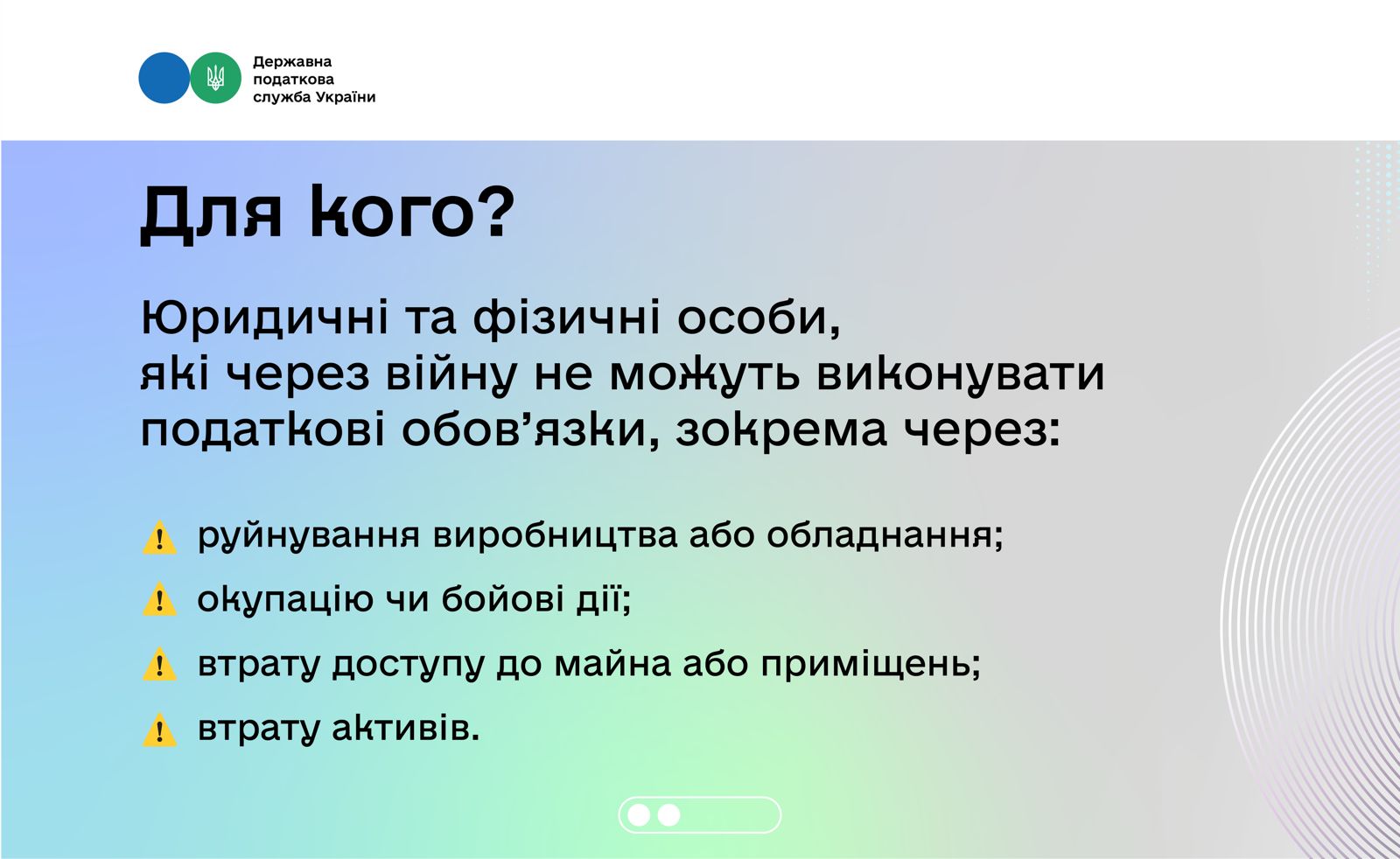 Юридичні та фізичні особи, які постраждали від російської агресії та не можуть виконувати свої податкові обов’язки через безпосередні наслідки бойових дій, зокрема: