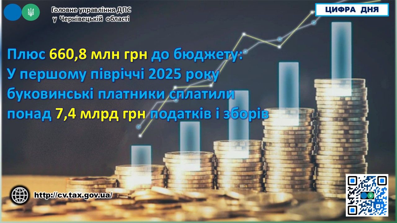 Зміцнення фінансової стабільності регіону: Податкові надходження Буковини демонструють значне зростання.У першому півріччі 2025 року платники податків Чернівецької області продемонстрували виняткову відповідальність та сумлінність, перерахувавши до бюджетів усіх рівнів вражаючі 7 мільярдів 415,7 мільйона гривень податків та зборів. Ця сума є наочним свідченням динамічного економічного розвитку регіону та значного збільшення фінансових ресурсів країни. Порівняно з аналогічним періодом минулого року, надходження зросли майже на 1 мільярд 885,5 мільйона гривень, що становить вражаючі 34,1 відсотка. Це є ключовим показником стабільного економічного зростання та ефективності фіскальної політики в області, що відображається у загальних податкових надходженнях.Значний внесок у державний та місцевий бюджетиДеталізуючи ці вражаючі показники, варто відзначити, що до загального фонду державного бюджету надійшло 4 мільярди 64,7 мільйона гривень. Це зростання на 1 мільярд 322,5 мільйона гривень, або 48,2 відсотка, порівняно з першим півріччям 2024 року. Такі значні податкові надходження до державного бюджету відіграють критично важливу роль у забезпеченні національних потреб, включаючи фінансування оборони та соціальних програм. Водночас, до місцевих бюджетів було сплачено 3 мільярди 351,0 мільйона гривень, що на 562,9 мільйона гривень, або 20,2 відсотка, більше, ніж за попередній рік. Ці кошти є основою для розвитку інфраструктури, освіти, медицини та інших сфер життєдіяльності громад на Буковині, сприяючи покращенню якості життя громадян.Підтвердження сумлінного ставлення до фінансових зобов’язаньПозитивна динаміка щодо сплати всіх видів податків і зборів яскраво демонструє сумлінне ставлення платників Чернівецької області до своїх фінансових зобов’язань. Це підтверджує глибоке розуміння бізнесом та громадянами важливості їхнього внеску у фінансове забезпечення потреб країни та, зокрема, підтримку Збройних Сил. Кожна сплачена гривня є інвестицією у стабільність, безпеку та майбутнє України, особливо у поточних умовах. Ці постійні податкові надходження є фундаментом для розвитку.Ключові бюджетоутворюючі платежі:Серед основних бюджетоформуючих платежів, що забезпечили такі високі податкові надходження, виділяються наступні категорії:🔷податок на доходи фізичних осіб: 2 мільярди 989,0 мільйона гривень, що на 503,0 мільйона гривень більше порівняно з минулим роком. Це свідчить про зростання зайнятості та доходів населення.🔷податок на додану вартість (ПДВ): 970,4 мільйона гривень, зі зростанням на 240,0 мільйона гривень. Збільшення надходжень від ПДВ відображає зростання споживчої активності та обсягів економічної діяльності.🔷військовий збір: 856,3 мільйона гривень, що є значним зростанням на 639,5 мільйона гривень. Цей показник особливо важливий, оскільки він безпосередньо спрямовується на потреби оборони країни.🔷єдиний податок: 576,1 мільйона гривень, збільшення на 83,1 мільйона гривень. Зростання єдиного податку свідчить про активний розвиток малого та середнього бізнесу в регіоні.податок на прибуток підприємств: 365,0 мільйона гривень, із зростанням на 77,0 мільйона гривень. Це вказує на прибутковість підприємств та їх внесок у державну скарбницю.Єдиний соціальний внесокКрім податкових надходжень, буковинці також активно сплачували єди