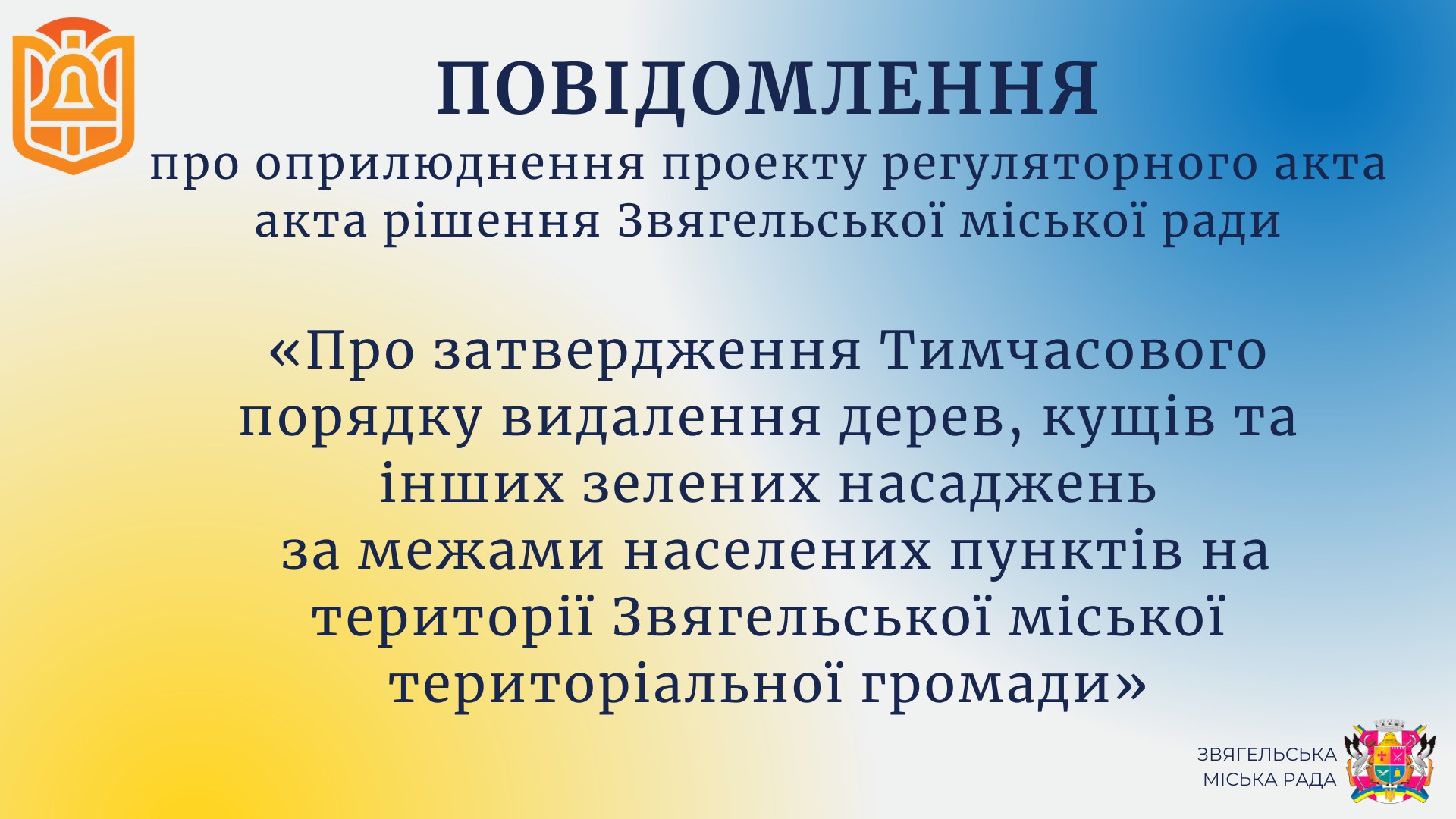 Звягельська міська рада повідомляє про оприлюднення проекту регуляторного акта, розробленого управлінням житлово-комунального господарства та екології. Йдеться про рішення Звягельської міської ради «Про затвердження Тимчасового порядку видалення дерев, кущів та інших зелених насаджень за межами населених пунктів на території Звягельської міської територіальної громади».