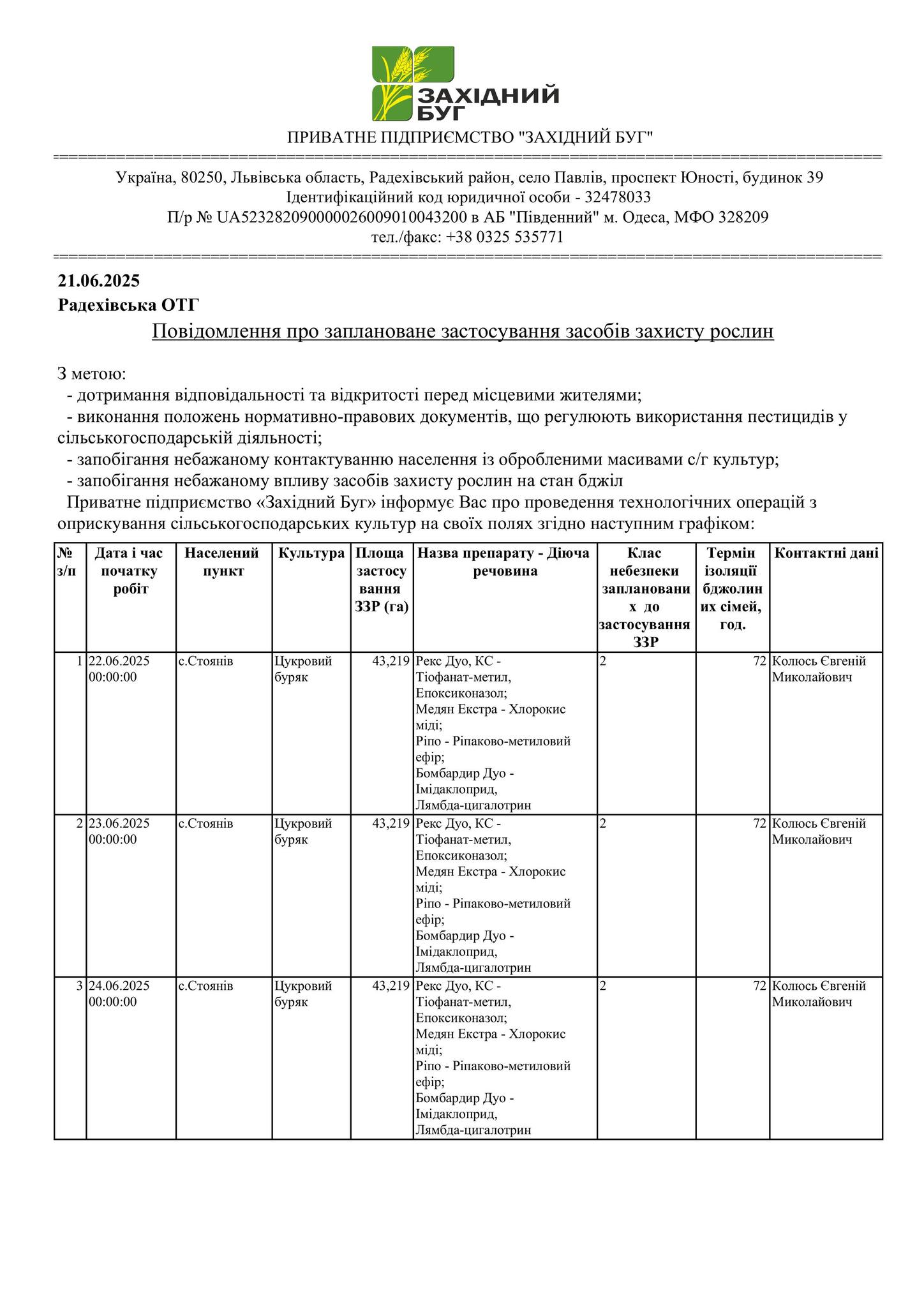 Діяльність підприємства «Західний Буг» спрямована на впровадження передових агротехнологій, які не лише підвищують продуктивність, але й сприяють збереженню природних ресурсів. Регулярне застосування засобів захисту рослин є запорукою того, що українські поля зможуть забезпечувати населення якісною продукцією. Кожна операція з обприскування полів ретельно контролюється, а працівники проходять відповідне навчання для забезпечення безпеки сільськогосподарських робіт. Ми прагнемо до відкритості та готові відповісти на всі питання щодо наших агротехнологій та заходів безпеки. Дякуємо за розуміння та співпрацю.