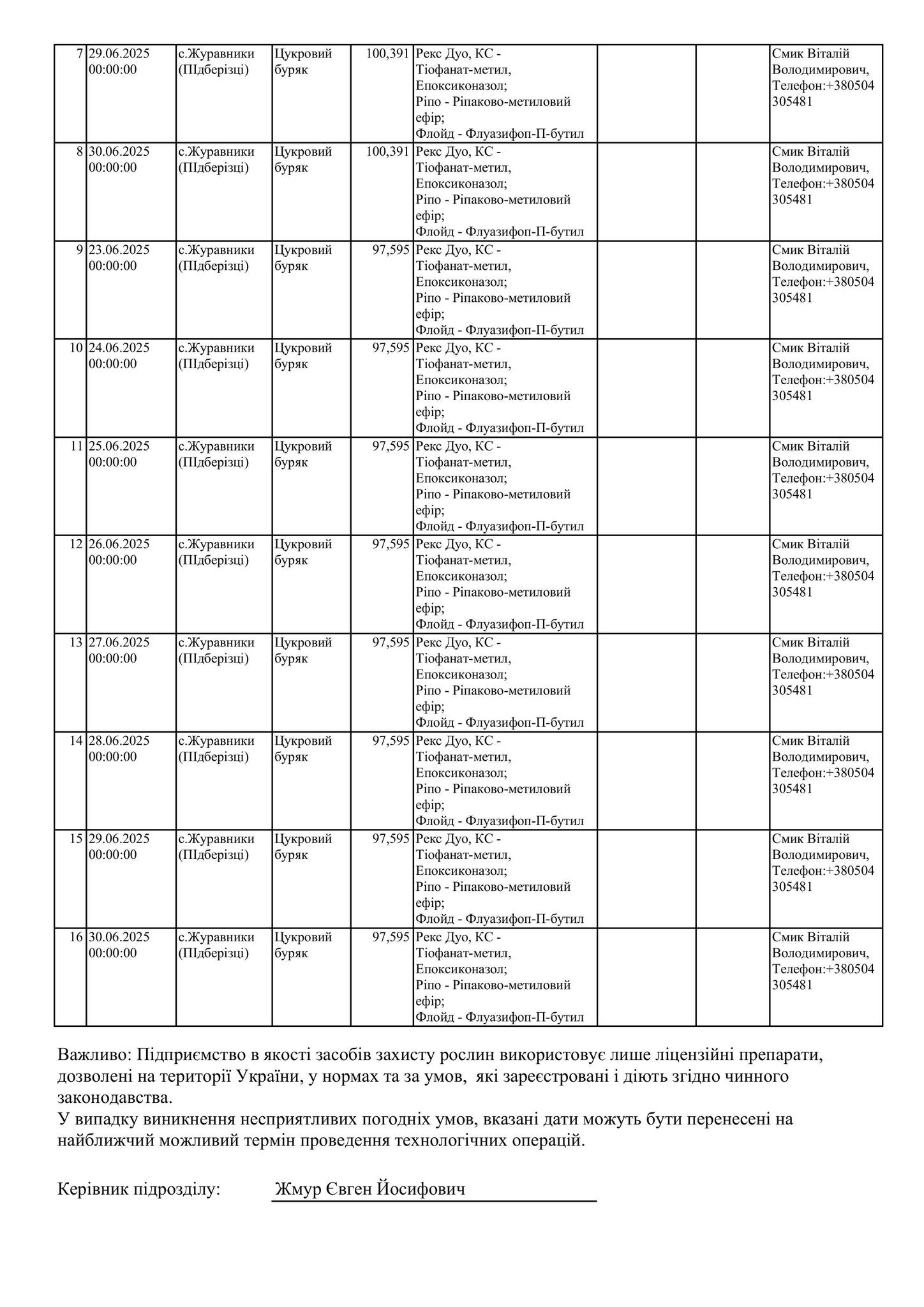 Приватне підприємство «Західний Буг» інформує Вас про проведення технологічних операцій з обприскування сільськогосподарських культур на своїх полях згідно наступним графіком. Ці важливі заходи є невід’ємною частиною сучасних агротехнологій, спрямованих на забезпечення високих та якісних врожаїв. Обприскування полів здійснюється для ефективного захисту рослин від шкідників, хвороб та бур’янів, що є ключовим фактором для сталого розвитку сільського господарства. Такі планові сільськогосподарські роботи допомагають підтримувати оптимальний стан ґрунту та забезпечувати здоров’я культур, сприяючи кращій врожайності.
