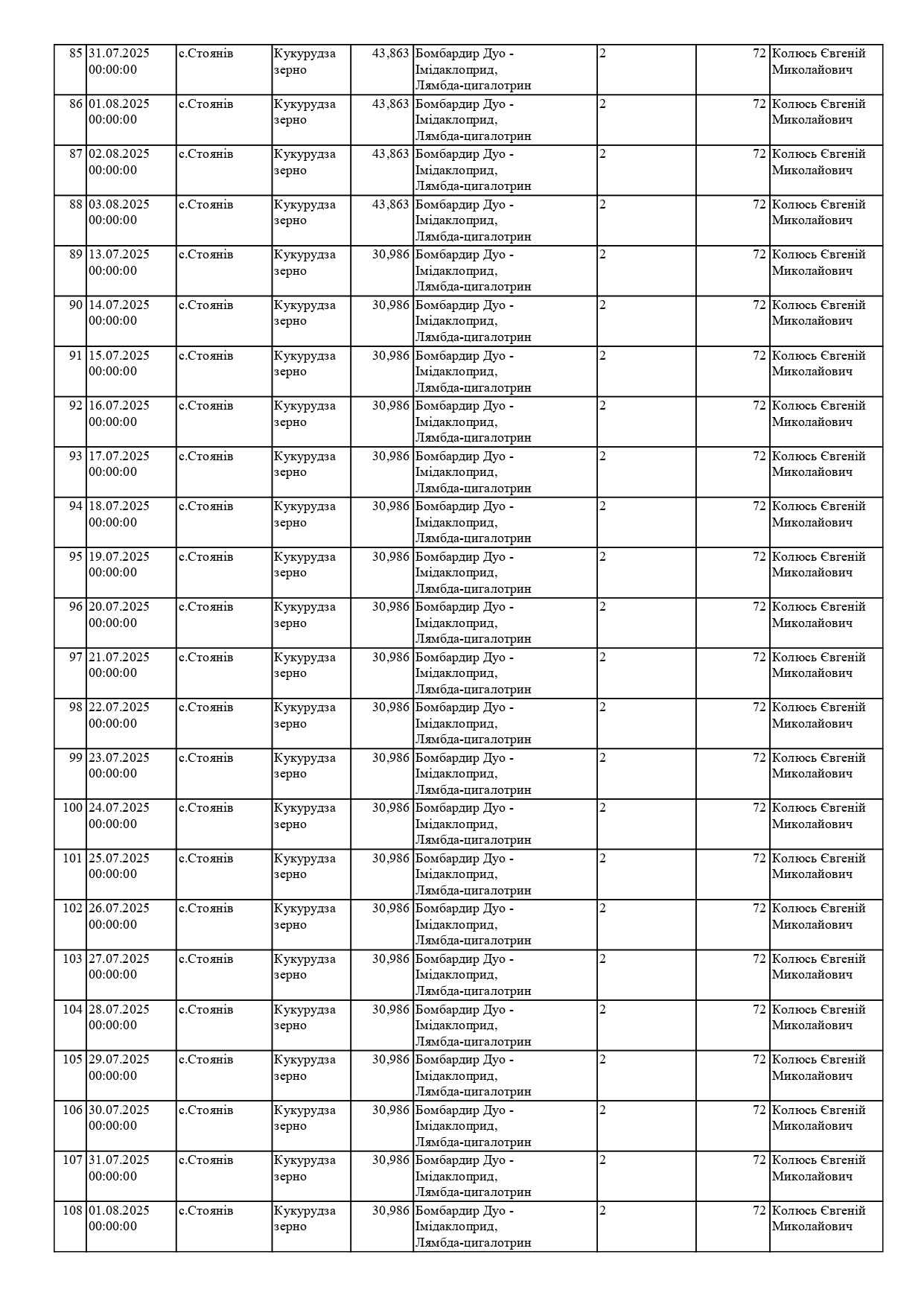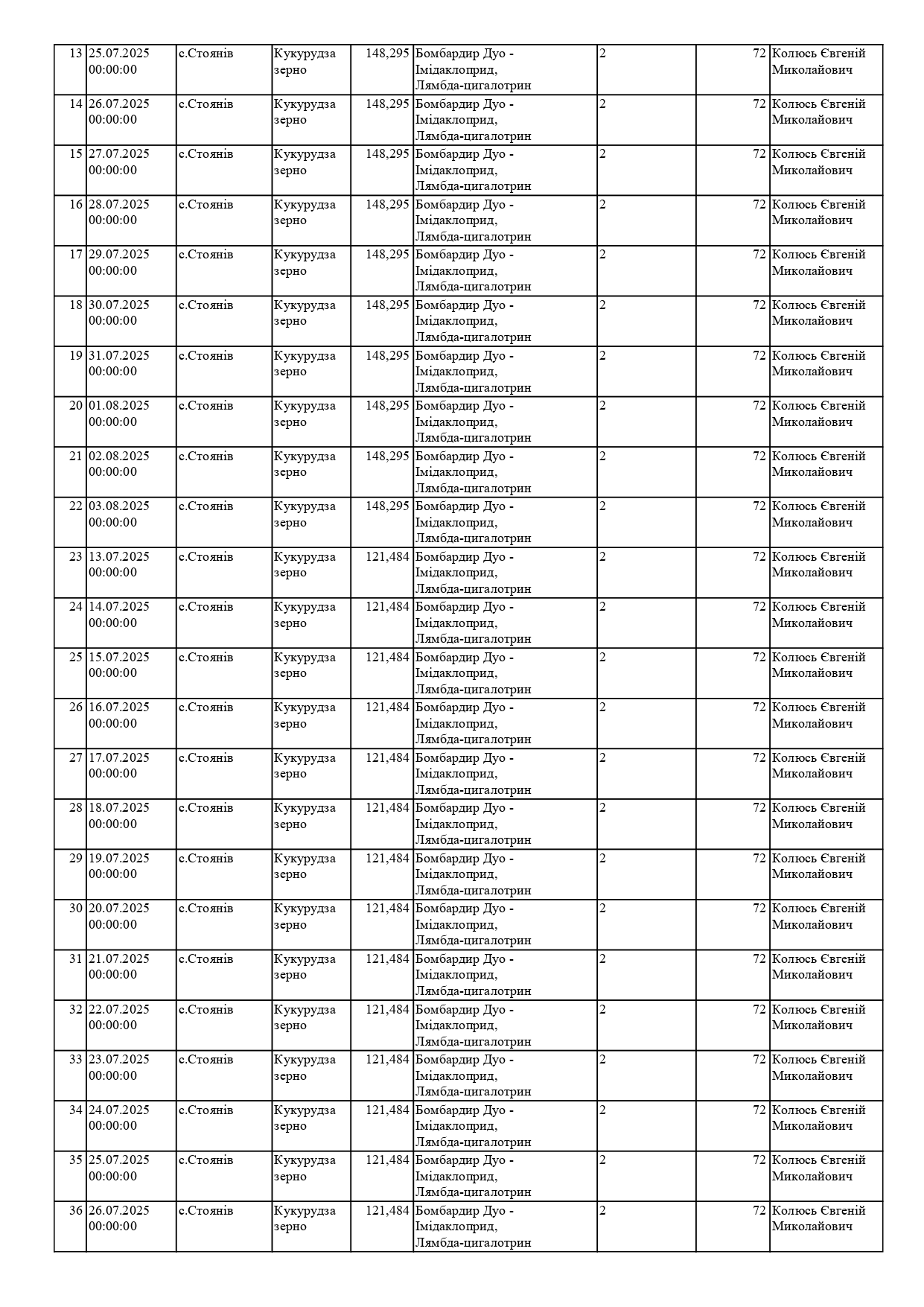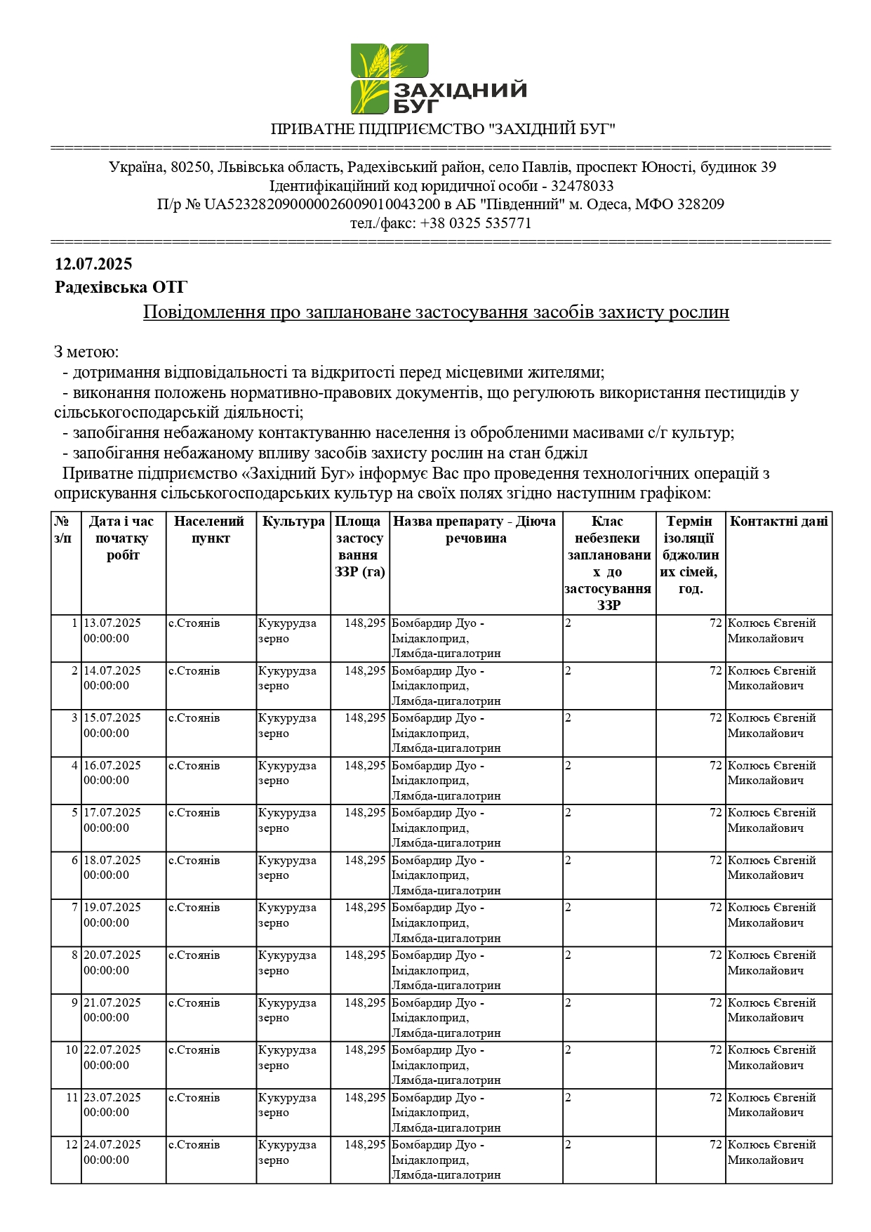 Приватне підприємство «Західний Буг» інформує Вас про проведення технологічних операцій з обприскування сільськогосподарських культур на своїх полях згідно наступним графіком.