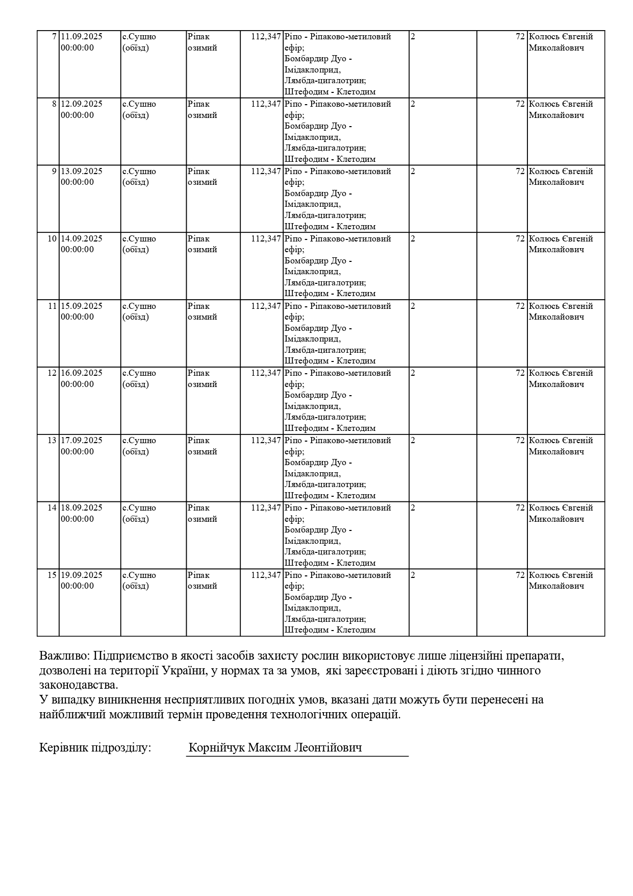 Наше підприємство планує провести технологічні операції з обприскування сільськогосподарських культур на полях відповідно до встановленого графіка. Це комплекс заходів, спрямованих на підтримку здоров’я рослин на всіх етапах їх розвитку. Сучасні засоби захисту рослин, які ми використовуємо, є високотехнологічними та безпечними при дотриманні всіх норм і правил застосування. Ми ретельно контролюємо весь процес, щоб мінімізувати будь-які потенційні ризики для довкілля та здоров’я людей. Наша мета – це не лише збільшення врожайності, але й забезпечення екологічної безпеки та сталого розвитку сільського господарства. Застосування засобів захисту рослин сприяє збереженню біорізноманіття на наших полях, оскільки здорові рослини є основою для існування багатьох корисних організмів. Ми зобов’язуємося дотримуватися всіх регламентів щодо використання пестицидів та агрохімікатів, забезпечуючи прозорість та відкритість інформації щодо наших виробничих процесів. Ми використовуємо передові методи моніторингу стану посівів та прогнозування розвитку захворювань і появи шкідників, що дозволяє нам застосовувати засоби захисту рослин лише тоді, коли це дійсно необхідно, і у мінімально необхідних дозах. Це відповідає принципам інтегрованого захисту рослин, який є основою нашого підходу до ведення сільського господарства. Ми постійно вдосконалюємо наші знання та практики, щоб наші поля були не тільки продуктивними, але й безпечними для всіх. Наші фахівці мають високу кваліфікацію та досвід у сфері захисту рослин. Вони стежать за останніми дослідженнями та розробками у цій галузі, щоб забезпечити найкращі результати. Ваше здоров’я та безпека – наш пріоритет. Ми відкриті до діалогу та готові відповісти на будь-які ваші запитання щодо наших методів роботи.
