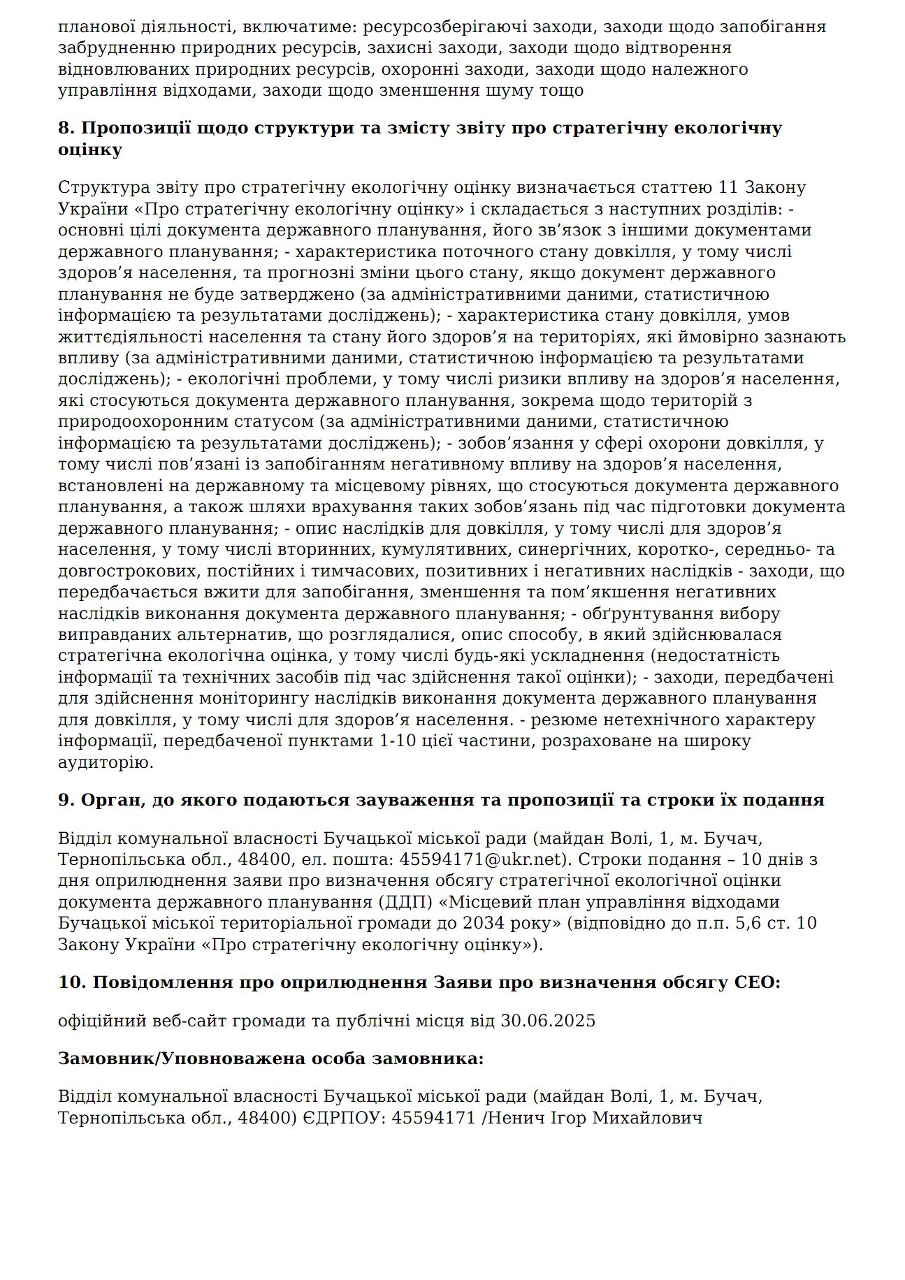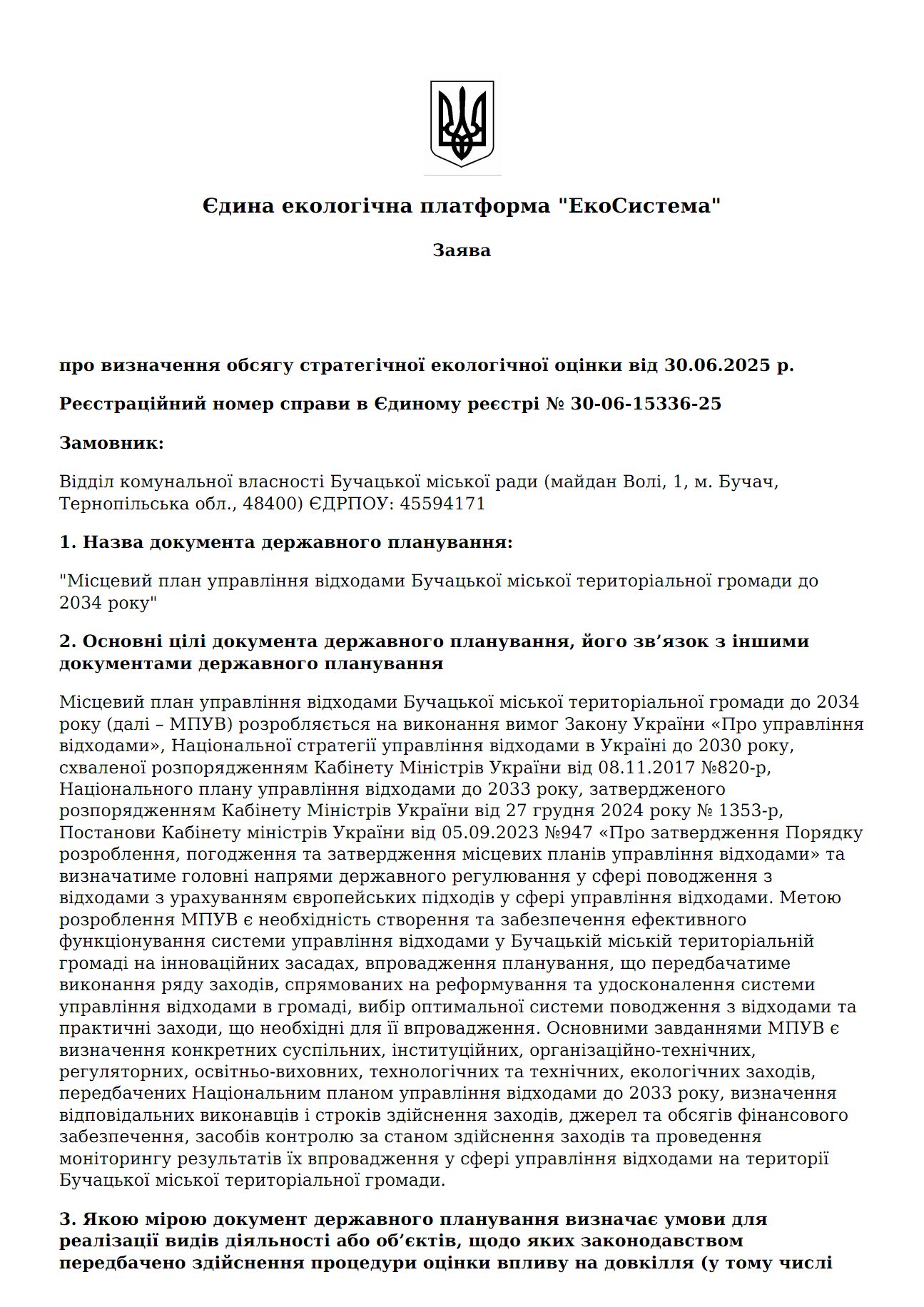 1. Заява про визначення обсягу стратегічної екологічної оцінки документа державного планування (ДДП) «Місцевий план управління відходами Бучацької міської територіальної громади до 2034 року».