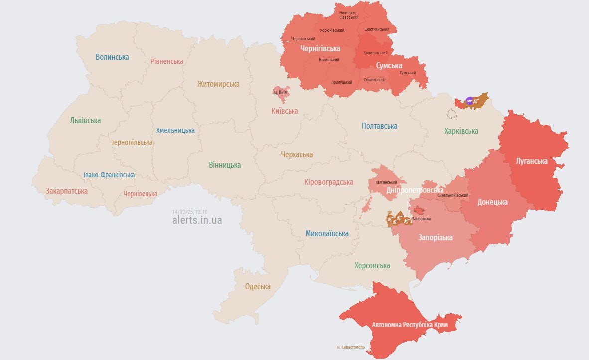 14 вересня вдень у Києві та низці областей було оголошено повітряну тривогу. Причиною стала загроза застосування балістичної зброї з півночі сходу. Про це повідомили Повітряні сили ЗСУ та поінформували на карті тривог у Telegram.