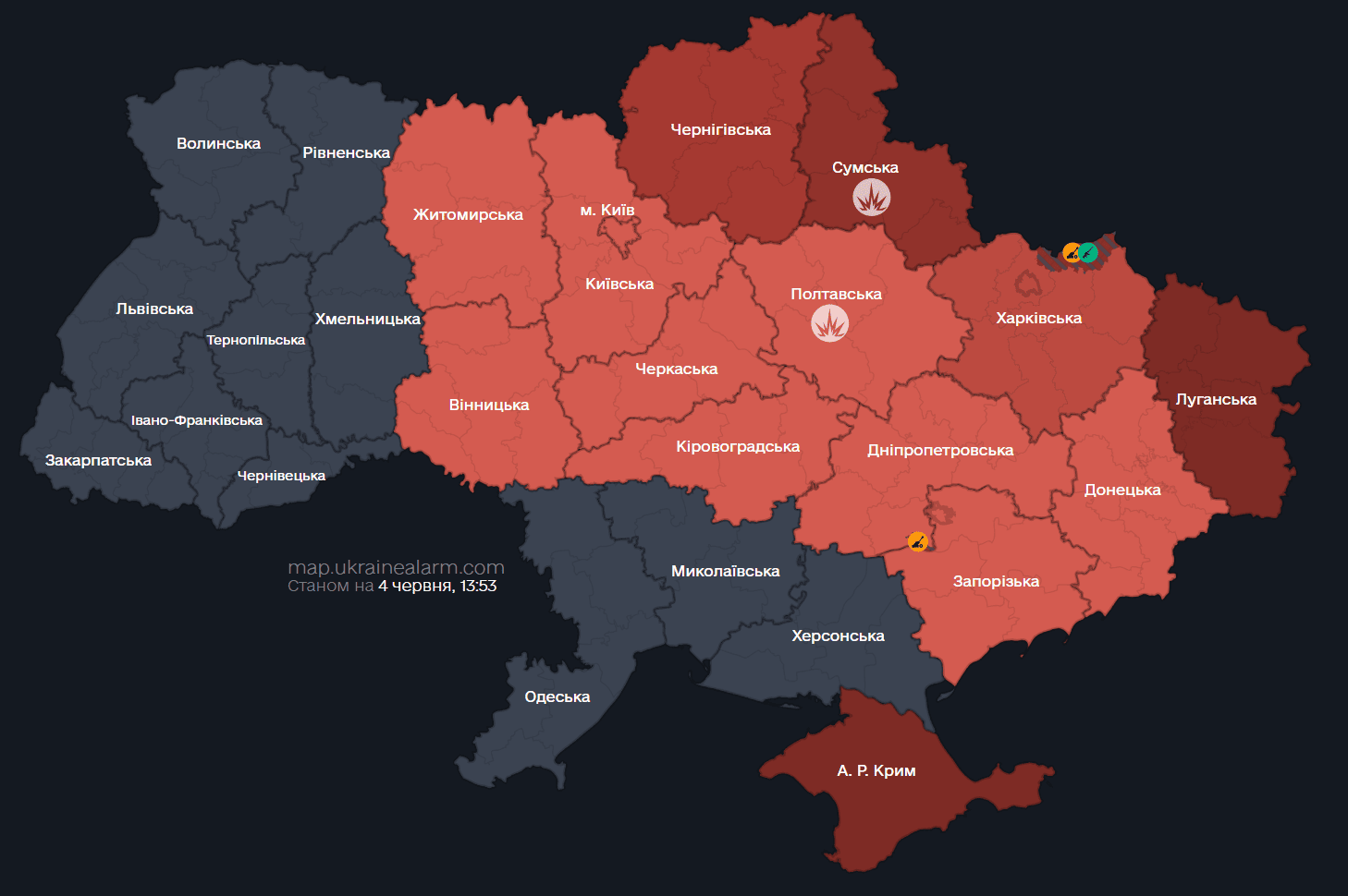 Станом на 13:53 4 червня, повітряна тривога була оголошена в таких областях: Сумській, Київській та м. Київ, Житомирській, Вінницькій, Харківській, Полтавській, Чернігівській, Дніпропетровській, Кіровоградській, Запорізькій, Донецькій, Луганській, Черкаській та АР Крим. Людям, які проживають в цих регіонах, слід бути максимально обережними.
