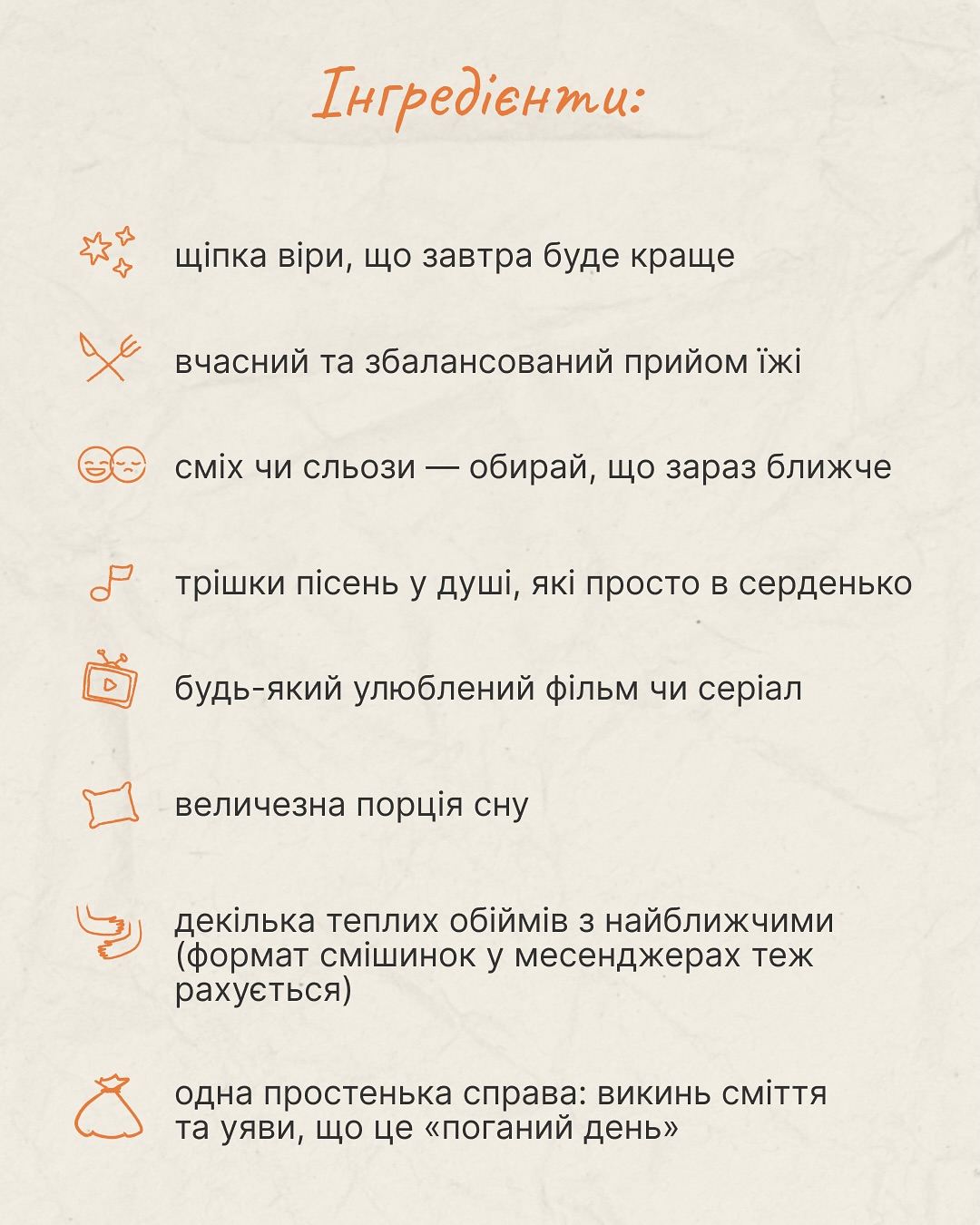 Навіть у найтемніші дні можна знайти промінчик світла та смаку 🫂. Якщо сьогодні ваш настрій залишає бажати кращого, ми пропонуємо вам зазирнути у світ затишних рецептів, які допоможуть підняти дух і зігріти душу. Спробуйте приготувати щось смачненьке, що подарує вам мить задоволення та позитивні емоції. Давайте разом створимо велику книгу антипоганоденних секретів! Поділіться своїми улюбленими рецептами або лайфхаками, які допомагають вам боротися з поганим настроєм, у коментарях під цим постом. Ваші історії та кулінарні знахідки можуть стати справжньою підтримкою для когось іншого.