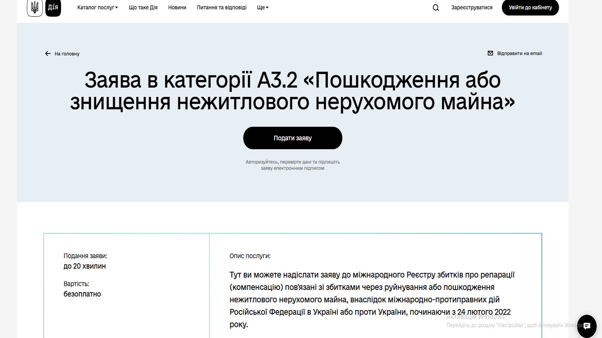Українці, чиє нежитлове майно було пошкоджене або зруйноване внаслідок російської агресії, можуть подати заяву на відшкодування збитків через портал Дія. Реєстр збитків вже приймає заяви за категорією А3.2 «Пошкодження або знищення нежитлового нерухомого майна». Це важливий крок для отримання компенсацій за завдані збитки. Дізнайтеся, як правильно подати заяву на відшкодування збитків.