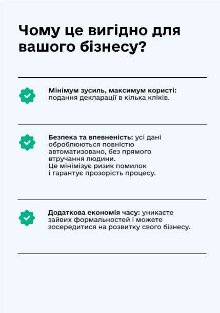 * **Цілодобовий доступ:** Подавайте декларацію у будь-який час доби, 7 днів на тиждень. Сервіс доступний 24/7, що дозволяє вам планувати подачу декларації відповідно до вашого графіка.