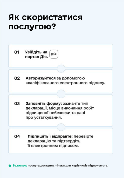 Реєстрація декларації відповідності матеріально-технічної бази вимогам законодавства з охорони праці тепер доступна онлайн! Забудьте про черги та паперову тяганину. Скористайтеся цифровим сервісом єДозвіл, який інтегровано з порталом “Дія” в межах комплексної послуги “е-Підприємець”. Подавайте декларацію відповідності швидко, безпечно та у зручний для вас час.