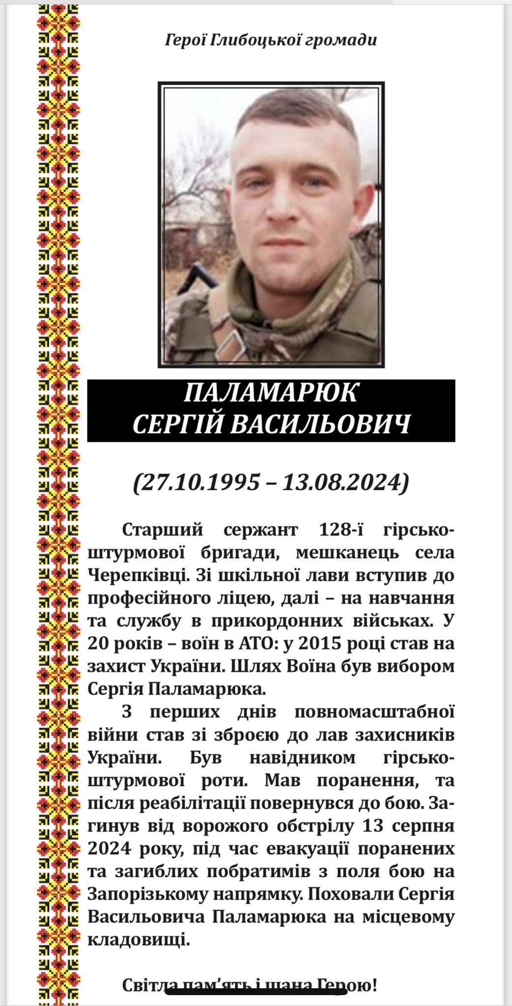 🥲Сьогодні дзвін памʼяті лунає на честь Героя, який з юного віку обрав шлях воїна. Старший сержант 128-ї гірсько-штурмової бригади, мешканець села Черепківці ПАЛАМАРЮК СЕРГІЙ ВАСИЛЬОВИЧ став до лав ЗСУ у своїх юних 20 літ. Цьогоріч йому мало б виповнитися щасливих 30, але клята війна забрала життя молодого воїна.