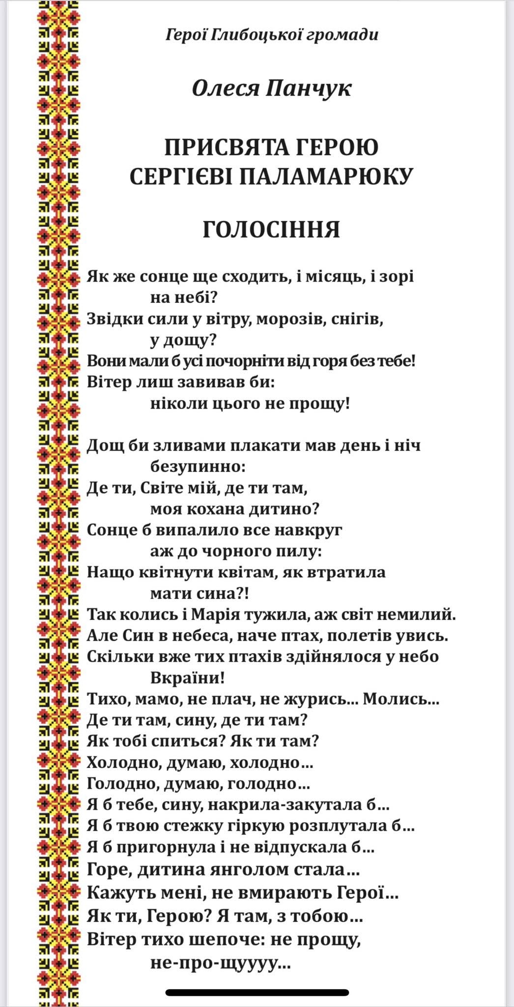 🔏Вірш-присвяту написала поетеса Олеся Панчук. Її проникливе «Голосіння» пронизане материнським болем і непримиренністю з ворогом: