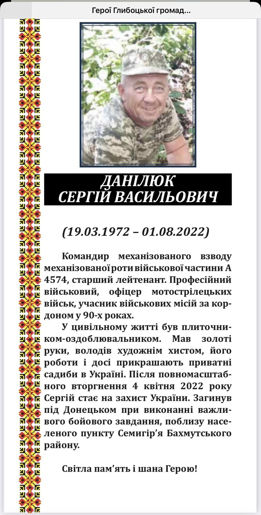 Сьогодні лунає дзвін пам’яті за полеглим Героєм – командиром механізованого взводу, старшим лейтенантом мотострілецьких військ Сергієм Данілюком. Ця пам’ятна звістка надійшла з села Стерче, де проживав наш Герой.