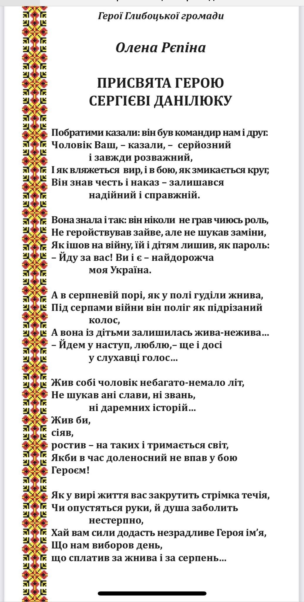 Ми звертаємося до кожного читача: у вирі буденних справ чи під час відпочинку знайдіть хвилину, щоб вклонитися світлому подвигу Героя Сергія Данілюка. Нехай його самовідданість надихає нас. В цей складний час, незалежно від сфери діяльності, кожна наша справа має бути варта високої ціни, сплаченої за життя і свободу нашої країни. Пам’ятаймо полеглих, вшановуймо живих.
