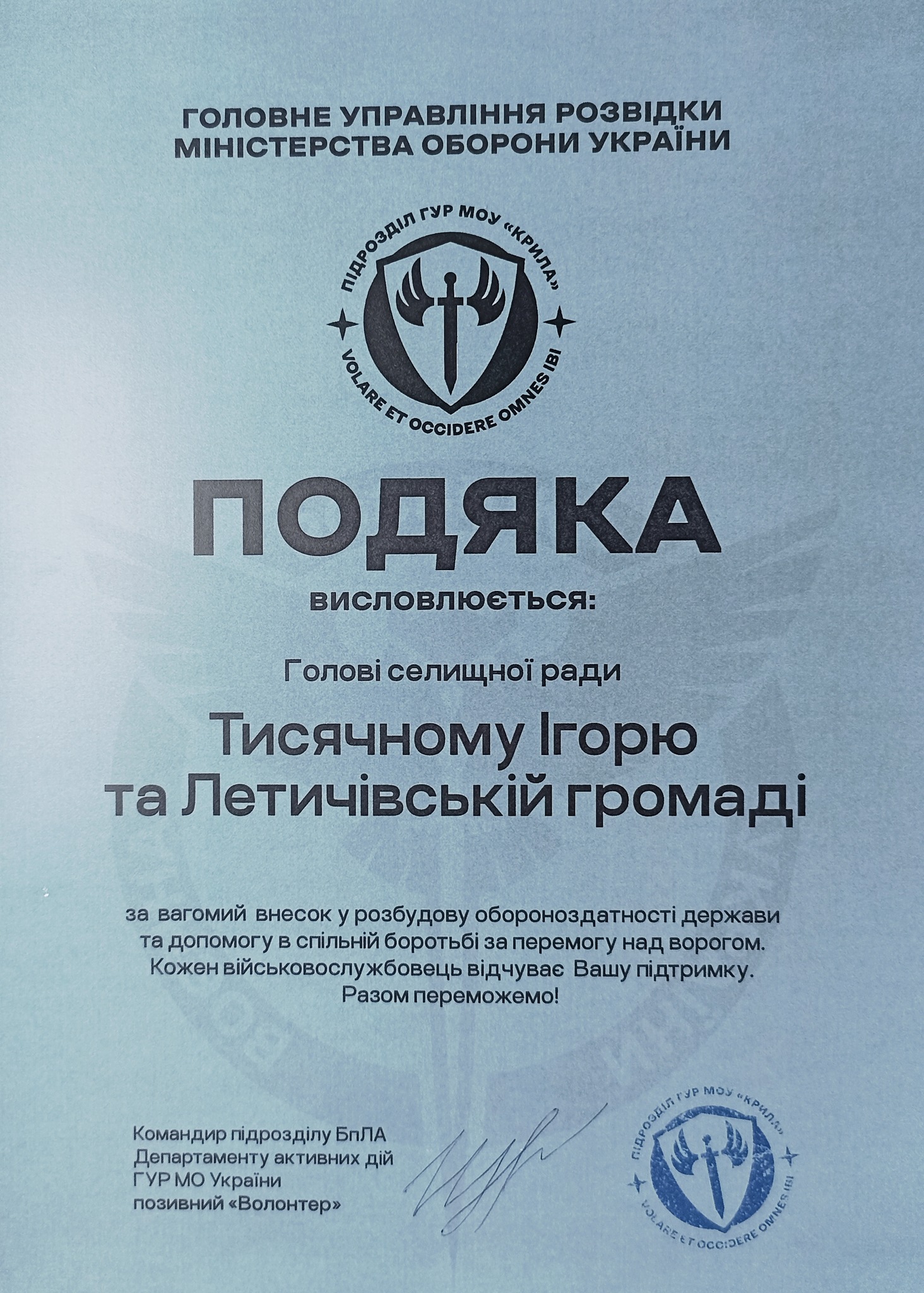 ПОДЯКА ЛЕТИЧІВСЬКОМУ СЕЛИЩНОМУ ГОЛОВІ ТА ГРОМАДІ
