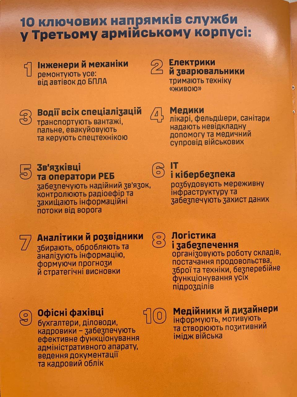 Саме тому запущено широку рекрутингову кампанію для залучення фахівців різних спеціальностей (див. перелік на фото). Є можливість долучитись навіть тим, хто перебуває в СЗЧ.