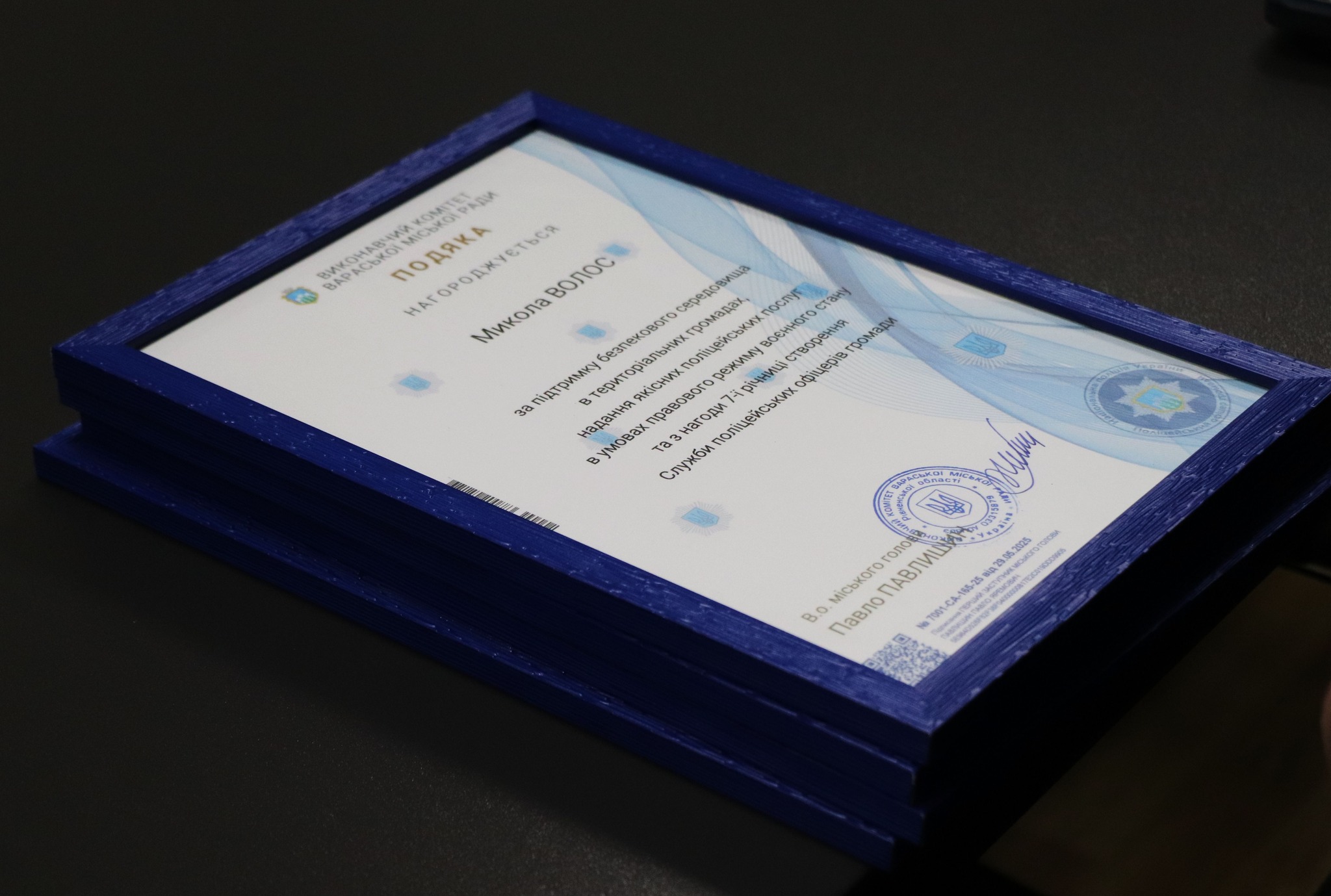 За значну підтримку безпекового середовища у Вараській територіальній громаді, надання якісних поліцейських послуг під час дії правового режиму воєнного стану та з нагоди 7-ої річниці створення служби поліцейських офіцерів громад, міським головою було оголошено подяку наступним офіцерам: